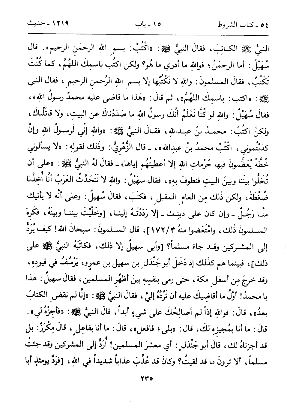 النبيُّ - صلى الله عليه وسلم - الكاتِبَ، فقالَ النبيُ - صلى الله عليه وسلم -: "اكْتُبْ: بسمِ اللهِ الرحمنِ الرحيم". قال سُهَيْلٌ: أما الرحمنُ؛ فواللهِ ما أدري ما هُو؛ ولكن اكتُبا باسمِكَ اللهُم، كما كُنْتَ تَكْتُبُ، فقالَ المسلمونَ: واللهِ لا نَكْتُبُها إلا بسمِ اللهِ الرحمنِ الرحيمِ، فقال النبي - صلى الله عليه وسلم -: "اكتب: باسمِكَ اللهُمً"، ثم قالَ: "هذا ما قاضى عليه محمد رسولُ اللهِ"، فقالَ سُهَيْل: واللهِ لو كُنًا نَعْلَمُ أنكَ رسولُ اللهِ ما صَدَدْناكَ عن البيتِ، ولا قاتَلْناكَ، ولكنْ اكتُبْ: محمدُ بنُ عبد اللهِ، فقالَ النبي - صلى الله عليه وسلم -: "واللهِ إنَي لَرسول اللهِ وإنْ كَذَبْتُموني، اكْتبْ محمدُ بنُ عبدِ الله"،- قال الزهْرِي: وذلك لقولهِ: "لا يسألوني خُطَةً يُعَظمونَ فيها حُرُماتِ اللهِ إلا أعطيتُهُم إياها"- فقالَ لهُ النبي - صلى الله عليه وسلم -: "على أن تُخَلوا بينَنا وبينَ البيتِ فنطوفَ بهِ"، فقال سهَيْل: واللهِ لا تَتَحَدثُ العَرَبُ أنًا اخِذْنا ضُغْطَةً، ولكن ذلك مِن العامِ المقبلِ، فكتَبَ، فقالَ سُهيل: وعلى أنَّه لا يأتيك منَا رَجُل- وإن كان على دينِك- إلا رَدَدْتَهُ إلينا، أوخَليْتَ بيننا وبينَهُ، فكَرِهَ المسلمونَ ذلك، وامْتَعَضوا منهُ 3/ 172]، قال المسلمونَ: سبحانَ الله! كيف يُرَد إلى المشركين وقد جاءَ مسلماً؛ [وأبى سهيل إلا ذلك، فكاتَبَهُ النبي - صلى الله عليه وسلم - على ذلك]، فبينما هم كذلك إذ دَخَلَ أبو جَنْدَلِ بن سهيل بن عمرو، يَرْسُفُ في قيودِهِ،