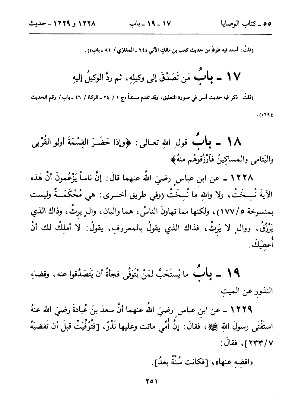 1228 - عن ابنِ عباسٍ رضيَ الله عنهما قالَ: إن ناساً يَزْعُمونَ أن هذه الآيةَ نُسِخَتْ، ولا واللهِ ما نُسِخَتْ (وفي طريق أخرى: هي مُحْكَمَة وليست بمنسوخة 5/ 177)، ولكنها مما تهاونَ الناسُ، هما واليانِ، والٍ يرِثُ، وذاك الذي يَرْزُقُ، ووال لا يَرِثُ، فذاك الذي يقولُ بالمعروفِ، يقولُ: لا أملِكُ لك أنْ اعطِيَكَ.