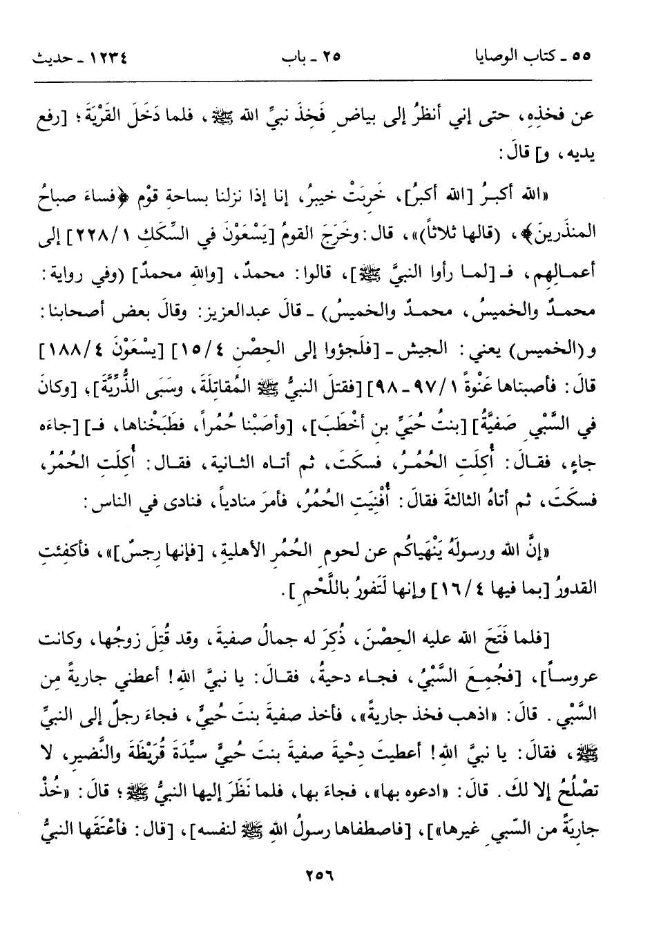 يديه، و] قالَ: "الله أكبرُ [الله أكبرُ]، خَرِبتْ خيبرُ، إنا إذا نزلنا بساحةِ قوْم {فَسَاءَ صَبَاحُ الْمُنْذَرِينَ}، (قالها ثلاثاً) "، قال: وخَرَجَ القوم [يَسْعَوْنَ في السِّكَكِ 1/ 228] إلى أعمالِهِم، ف [لما رأوا النبي - صلى الله عليه وسلم -]، قالوا: محمدٌ، [واللهِ محمدٌ] (وفي روايةٍ: محمدٌ والخميسُ، محمدٌ والخميسُ) - قالَ عبد العزيز: وقالَ بعض أصحابنا: و (الخميس) يعني: الجيش-[فلَجؤوا إلى الحِصْنِ 4/ 15] [يسْعَوْنَ 4/ 188] قالَ: فأصبناها عَنْوةً 1/ 97 - 98] [فقتلَ النبي- صلى الله عليه وسلم - المقاتِلَةَ، وسَبَى الذُريةَ]؛ [وكانَ في السبْيِ صَفيةُ] [بنتُ حُيي بنِ أخْطَبَ]، [وأصَبْنا حُمُراً، فطَبَخْناها، فـ] [جاءَه