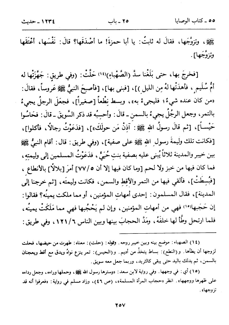 [فخرجَ بها، حتى بَلَغْنا سد (الصهْباءِ) (14) حَلتْ: (وفي طريقٍ: جَهزَتْها له أمُّ سُلَيمٍ، فأهدَتْها لهُ مِن الليلِ)]، [فبنى بها]، [فاصبحَ النبي - صلى الله عليه وسلم - عَروساً، فقالَ: "من كان عنده شيءٌ؛ فليجىءْ به"، وبسط نِطْعاً [صغيراً]، فجعَلَ الرجلُ يجيءُ بالتمر، وجعل الرجُلُ يجيءُ بالسمن- قالَ: وأحسِبُه قد ذكر السويقَ- قالَ: فحَاسُوا حَيْساً]، [ثم قالَ رسولُ اللهِ - صلى الله عليه وسلم -: آذِنْ مَن حولَكَ"]، [فدَعَوْتُ رجالًا، فأكلوا]، [فكانت تلك وليمةَ رسولِ اللهِ - صلى الله عليه وسلم - على صفية]، (وفي طريق: قال: أقام النبي - صلى الله عليه وسلم - بين خيبر والمدينة ثلاثاً يُبنى عليه بصفية بنتِ حُيي، فدَعَوْتُ المسلمين إلى وليمتِهِ، فما كان فيها من خبز ولا لحم [وما كان فيها إلا أن 5/ 77] أمرَ [بلالًا] بالأنطاعِ، [فبُسِطَتْ]، فألقي فيها من التمر والأقِطِ والسمن، فكانت وليمتَه، [ثم خرجنا إلى المدينة]، فقال المسلمون: إحدى أمهاتِ المؤمنين، أو مما ملكت يمينُه؛ فقالوا: إن حَجَبها (15) فهي من أمهاتِ المؤمنين، وإن لم يَحْجُبها فهي مما مَلَكَتْ يمينُه، فلما ارتحل وطَأ لها خلفَهُ، ومَد الحجابَ بينها وبين الناس 6/ 121، وفي طريق: