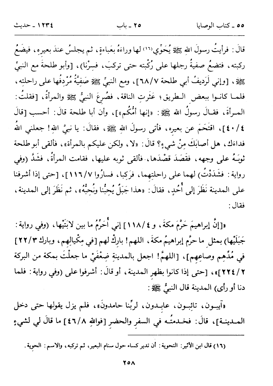 قالَ: فرأيتُ رسولَ اللهِ - صلى الله عليه وسلم - يُحَوي (16) لها وراءَهُ بعَباءةٍ، ثم يجلسُ عندَ بعيرِهِ، فيضَعُ ركبته، فتضعُ صفيةُ رجلها على رُكْبته حتى تركبَ، فسِرْنا)، [وأبوطلحةَ مع النبي - صلى الله عليه وسلم -، [وإني لَرَديفُ أبي طلحة 7/ 68]، ومع النبيَّ - صلى الله عليه وسلم - صَفِيَّةُ مُرْدِفُها على راحلتِه، فلما كانوا ببعضِ الطريق؛ عَثَرتِ الناقة، فصُرِعَ النبيُ - صلى الله عليه وسلم - والمرأةُ، [فقلتُ: المرأةَ، فقالَ رسولُ الله - صلى الله عليه وسلم -: "إنها أمُكُم"]، وأن أبا طلحة قالَ: أحسب [قالَ 40/ 4]، اقتَحَمَ عن بعيرِه، فأتى رسولَ اللهِ - صلى الله عليه وسلم -، فقالَ: يا نبيً اللهِ! جعلني اللهُ فداءَك، هل أصابَكَ مِنْ شيءٍ؛ قالَ: "لا، ولكن عليكم بالمرأة"، فألقى أبو طلحة ثوبه على وجهه، فقَصَدَ قصْدَها". فألقى ثوبه عليها، فقامت المرأةُ، فشَدً (وفي روايةٍ: فشَدَدْتُ) لهما على راحلتِهِما، فرَكِبا، فسارُوا 7/ 116]، [حتى إذا أشرفنا على المدينة نَظَرَ إلى أحُدٍ، فقالَ: "هذا جَبَلٌ يُحِبنا ونُحِبُّهُ"، ثم نَظَرَ إلى المدينة، فقال: