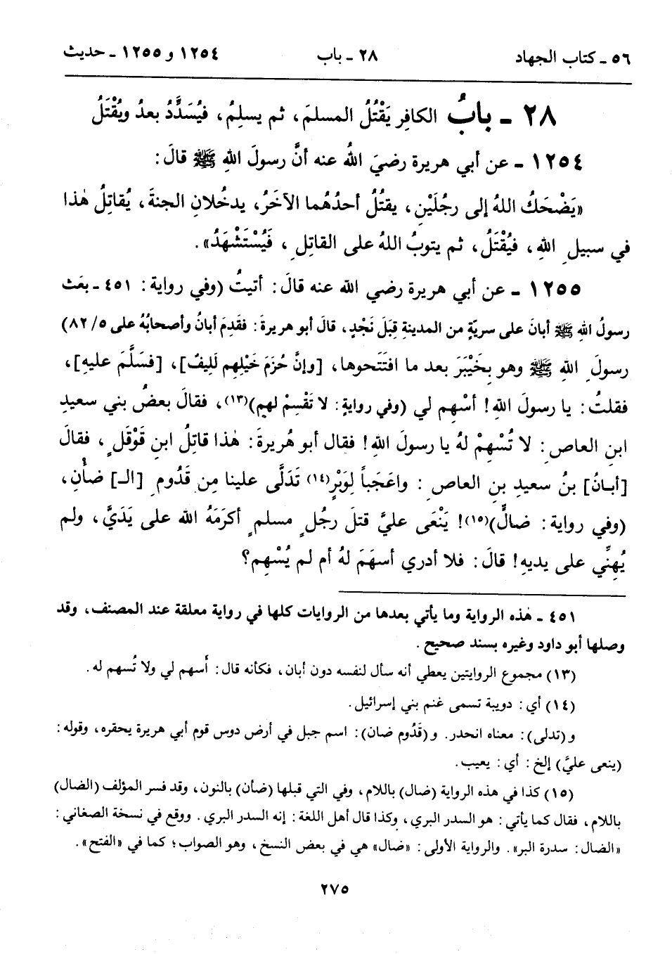 1254 - عن أبي هريرة رضيَ الله عنه أن رسولَ الله - صلى الله عليه وسلم - قالَ: "يَضْحَكُ اللهُ إلى رجلَيْنِ، يقتُل أحدُهما الأخَر، يدخُلانِ الجنةَ، يقاتِل هذا في سبيلِ اللهِ، فيُقْتَلُ، ثم يتوبُ اللهُ على القاتِلِ، فَيُسْتَشْهَد".