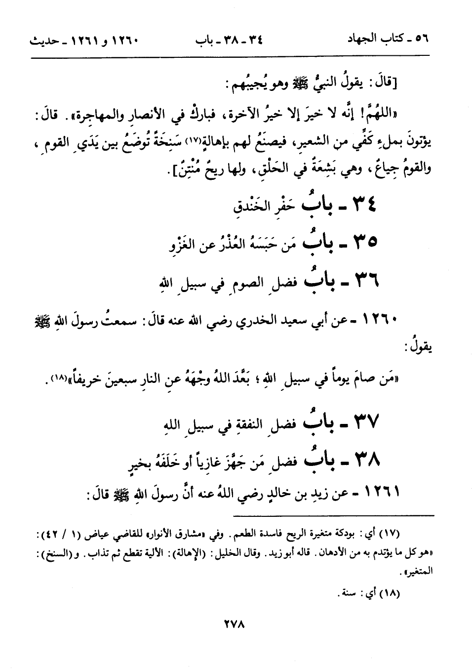 1260 - عن أبي سعيد الخدري رضي الله عنه قالَ: سمعتُ رسولَ الله - صلى الله عليه وسلم - يقولُ: "مَن صامَ يوماً في سبيلِ الله؛ بَعدَ اللهُ وجْهَهُ عنِ النارِسبعينَ خريفاً" (18).