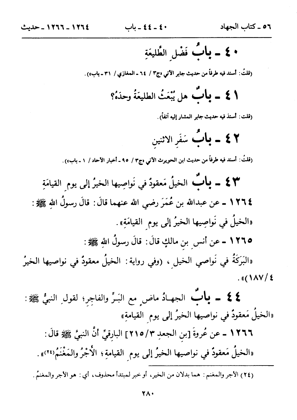 1266 - عن عُروةَ [بنِ الجعدِ 3/ 215] البارِقي أن النبي - صلى الله عليه وسلم - قالَ: "الخيلُ مَعقود في نواصيها الخيرُ إلى يومِ القيامةِ؛ الأجْرُ والمَغْنَمُ (24) ".