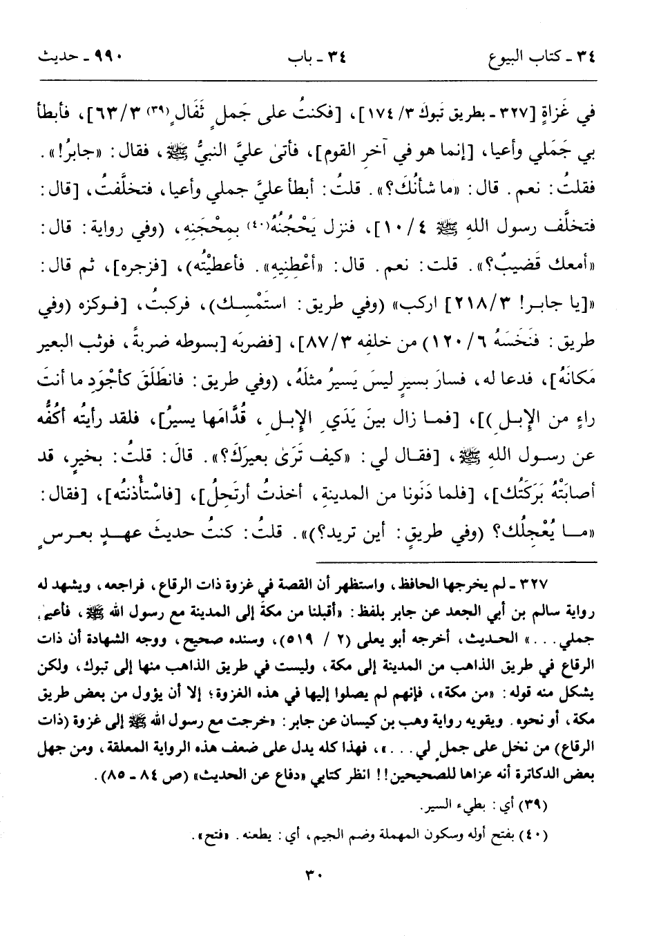 في غَزاةٍ [327 - بطريق تَبوكَ 3/ 174]، [فكنتُ على جَملٍ ثَفَالٍ (39) 3/ 63]، فأبطأ بي جَمَلي وأعيا، [إنما هو في آخرِ القوم]، فأتى عليَّ النبيُّ - صلى الله عليه وسلم -، فقال: "جابرُ! ". فقلتُ: نعم. قال: "ما شأنُكَ؟ ". قلتُ: أبطأ عليَّ جملي وأعيا، فتخلَّفتُ، [قال: فتخلَّف رسول اللهِ - صلى الله عليه وسلم - 4/ 10]، فنزل يَحْجُنُهُ (40) بمِحْجَنِهِ، (وفي روايةٍ: قال: "أمعك قَضيبٌ؟ ". قلت: نعم. قال: "أعْطِنِيهِ". فأعطيْتُه)، [فزجره]، ثم قال: