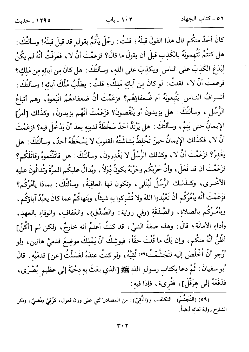 كان أحَدٌ منكُم قالَ هذا القولَ قبلَهُ؛ قلتُ: رجُلٌ يَأتَم بقول قد قيلَ قبلَهُ! وسألتُكَ: هل كنتُمْ تَتَهِمونَهُ بالكَذِبِ قبلَ أن يقولَ ما قالَ؟ فزعمْتَ أنْ لا، فعَرَفْتُ أنهُ لم يكُنْ لِيَدَعَ الكَذِبَ على الناسِ ويكذِبَ على اللهِ، وسألتُكَ: هل كانَ مِن آبائِهِ مِن مَلِكٍ؟ فزعمتَ أنْ لا، فقلتُ: لو كانَ مِن آبائِهِ مَلِكٌ؛ قلتُ: يطلُبُ مُلْكَ آبائِهِ! وسألتُكَ: أشرافُ الناسِ يَتبِعونَهُ أم ضُعفاؤهُم؟ فزَعَمْتَ أنَ ضعفاءَهُمُ اتَبَعوهُ، وهم أتباعُ الرسُلِ، وسألتُكَ: هل يزيدونَ أو يَنْقُصونَ؛ فزَعَمْتَ أنَهُم يزيدونَ، وكذلك [أمرُ] الِإيمانُ حتى يَتِم، وسألتُكَ: هل يَرْتَدُّ أحَدٌ سَخْطَةً لدينِهِ بعدَ أنْ يَدْخُلَ فيه؟ فزعَمْتَ أنْ لا، فكذلك الِإيمانُ حينَ تَخْلِطُ بَشاشَتُهُ القلوبَ لا يَسْخَطُهُ أحدٌ، وسألتُكَ: هل يَغْدِرُ؟ فزَعَمْتَ أنْ لا، وكذلك الرُسُلُ لا يَغْدِرونَ، وسألتُكَ: هل قاتَلْتُموهُ وقاتَلَكُم؟ فزَعَمْتَ أن قد فَعَلَ، وأنَّ حَرْبكُم وحَرْبهُ يكونُ دُوَلاً، ويُدالُ عليكُم المرة وتُدالُونَ عليهِ الأخْرى، وكذلك الرسُلُ تُبْتَلى، وتكون لها العاقِبَةُ، وسألتُكَ: بماذا يامُرُكُم؟ فزَعَمْتَ أنه يأمُرُكُم أنْ تَعْبُدوا اللهَ ولا تُشْرِكوا بهِ شيئاً، ويَنهاكُمْ عما كانَ يعبُدُ آباؤكُم، ويأمُرُكُم بالصلاةِ، والصًدَقَةِ (وفي روايةٍ: والصِّدْقِ)، والعَفافِ، والوفاءِ بالعهدِ، وأداءِ الأمانَة؛ قالَ: وهذه صفةُ النبيَّ، قد كنتُ أعلمُ أنه خارفيٌ، ولكن لم [أكُنْ] أظُنُ أنَهُ منكُم، وإن يَكُ ما قُلْتَ حقّاً؛ فيوشِكُ أنْ يَمْلِكَ موضِعَ قدميً هاتين، ولو أرْجو أنْ اخْلُصَ إليه لتَجَشمْتُ (59) لُقِيهُ، ولو كنتُ عندَهُ لغَسَلْتُ [عن] قدمَيْهِ. قالَ أبو سفيانَ: ثُمً دعا بكتابِ رسولِ اللهِ - صلى الله عليه وسلم -[الذي بعَثَ بهِ دِحْيَةَ إلى عظيمِ بُصْرى، فدَفَعَهُ إلى هِرَقْلَ]، فقُرِىءَ، فإذا فيهِ: