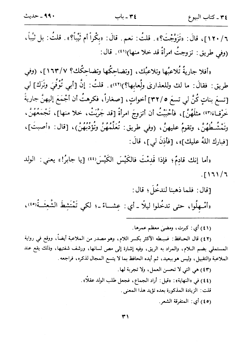 6/ 120]، قالَ: "تَزَوَّجْتَ؟ ". قلتُ: نعم. قالَ: "بِكْراً أم ثَيِّباً؟ ". قلتُ: بل ثيِّباً، (وفي طريق: تزوجتُ امرأةً قد خلا منها) (41). قال: