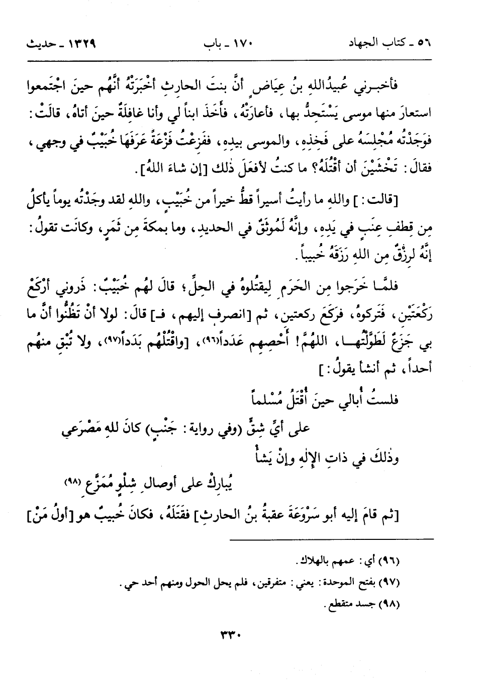 فلمَّا خَرَجوا مِن الحَرَمِ لِيقتُلوهُ في الحِلِّ؛ قالَ لهُم خُبَيْبٌ: ذَروني أرْكَعْ رَكْعَتَيْنِ، فَتَركوهُ، فرَكَعَ ركعتين، ثم [انصرف إليهم، فـ] قالَ: لولا أنْ تَظُنُّوا أنَّ ما بي جَزعٌ لَطَوَّلْتُها، اللهُمَّ! أَحْصِهِم عَدَداً (96)، [واقْتُلْهُم بَدَداً (97)، ولا تُبْقِ منهُم أحداً، ثم أنشا يقولُ:]