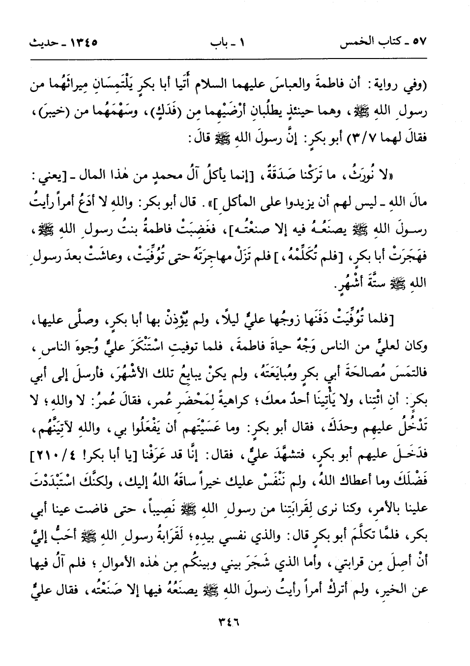 "لا نُورَثُ، ما تَرَكْنا صَدَقَةٌ، [إنما يأكلُ آلُ محمدٍ من هذا المال-[يعني: مالَ اللهِ- ليس لهم أن يزيدوا على المأكلِ] ". قال أبو بكر: واللهِ لا أدَعُ أمراً رأيتُ رسولَ اللهِ - صلى الله عليه وسلم - يصنَعُهُ فيه إلا صنعْتُه]، فغَضِبَتْ فاطمةُ بنتُ رسولِ اللهِ - صلى الله عليه وسلم -، فهَجَرَتْ أبا بكرٍ، [فلم تُكَلِّمْهُ]، فلم تَزَلْ مهاجِرَتَهُ حتى تُوُفِّيَتْ، وعاشَتْ بعدَ رسولِ اللهِ - صلى الله عليه وسلم - ستَّةَ أشْهُرٍ.