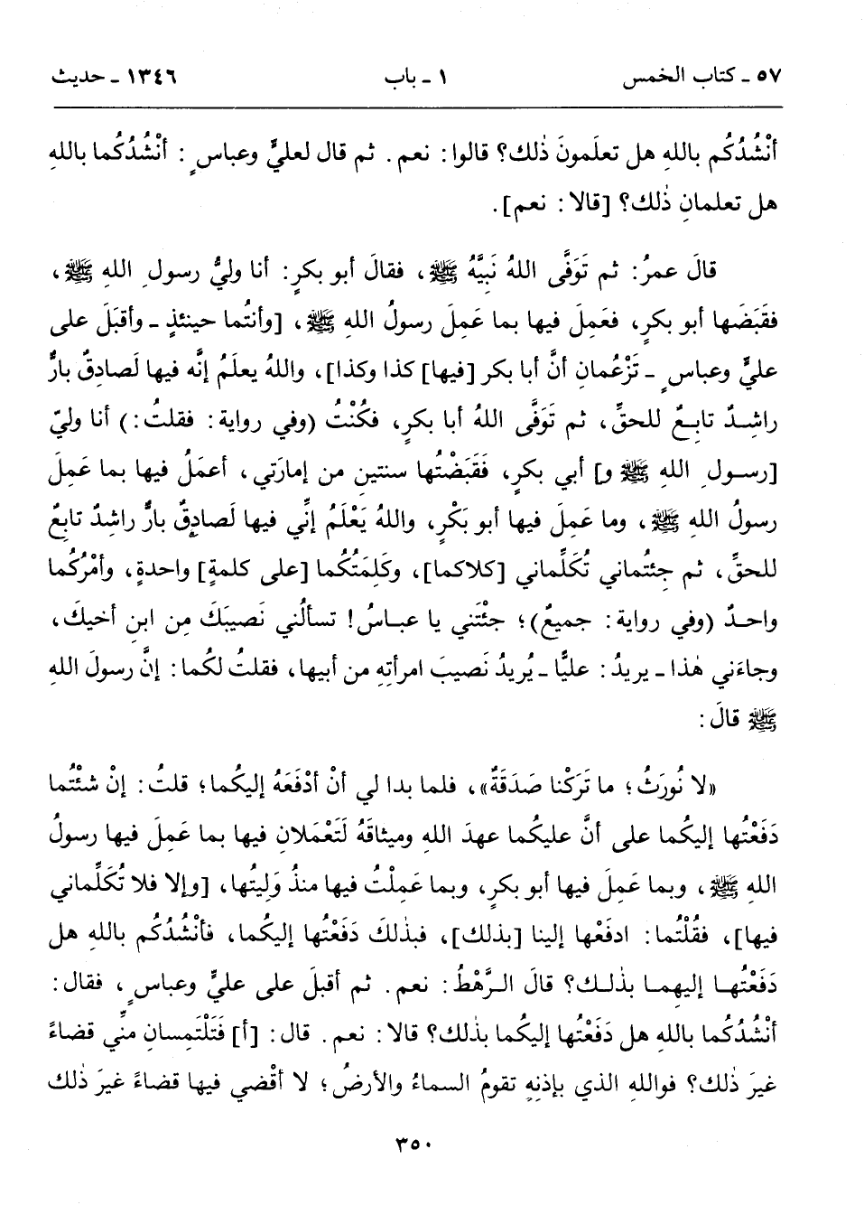 "لا نُورَثُ، ما ترَكْنا صَدَقَةٌ"، فلما بدا لي أنْ أدْفَعَهُ إليكُما؛ قلتُ: إنْ شئْتُما دَفَعْتُها إليكُما على أنَّ عليكُما عهدَ اللهِ وميثاقَهُ لَتَعْمَلانِ فيها بما عَمِلَ فيها رسولُ اللهِ - صلى الله عليه وسلم -، وبما عَمِلَ فيها أبو بكرٍ، وبما عَمِلْتُ فيها منذُ وَلِيتُها، [وإلا فلا تُكَلِّماني فيها]، فقُلْتُما: ادفَعْها إلينا [بذلك]، فبذلكَ دَفَعْتُها إليكُما، فأنْشُدُكُم باللهِ هل دَفَعْتُها إليهِما بذلك؟ قالَ الرَّهْطُ: نعم. ثم أقبلَ على علىٍّ وعباسٍ، فقال: