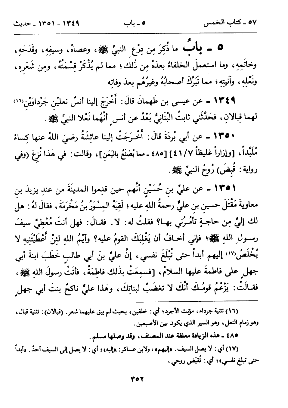5 - باب مَا ذُكِرَ مِنْ دِرْعِ النَّبِىِّ - صلى الله عليه وسلم -، وعصاهُ، وسيفِهِ، وقَدَحِهِ، وخاتَمِهِ، وما استعملَ الخلفاءُ بعدَهُ مِن ذلك؛ مما لم يُذْكَرْ قِسْمَتُهُ، ومِن شَعَرِهِ، ونَعْلِهِ، وآنيتِهِ؛ مما تَبَرَّكَ أصحابُهُ وغيرُهُم بعدَ وفاتِه