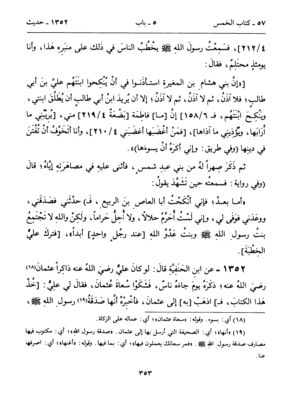 1352 - عن ابنِ الحَنَفِيَّةِ قالَ: لو كانَ عليٌّ رضيَ اللهُ عنه ذاكِراً عثمانَ (18) رضيَ اللهُ عنه؛ ذكَرَهُ يومَ جاءَهُ ناسٌ، فَشَكَوْا سُعاةَ عُثمانَ، فقالَ لي علِيٌّ: [خُذْ هذا الكتابَ، فـ] اذهَبْ [به] إلى عثمانَ، فأخْبِرْهُ أنَّها صَدَقَةُ (19) رسولِ اللهِ - صلى الله عليه وسلم -،