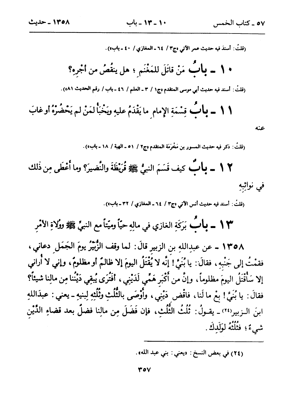1358 - عن عبدِ اللهِ بنِ الزبيرِ قالَ: لما وقف الزُّبَيْرُ يومَ الجَمَلِ دعاني، فقمْتُ إلى جَنْبِهِ، فقالَ: يا بُنَيَّ! إنَّه لا يُقْتَلُ اليومَ إلا ظالمٌ أو مظلومٌ، وإني لا أُراني إلا سَأُقْتَلُ اليومَ مظلوماً، وإنَّ من أكْبَرِ هَمِّي لَدَيْنِي، أفَتُرَى يُبقِي دَيْنُنا عِن مالِنا شيئاً؟ فقالَ: يا بُنَيَّ! بِعْ ما لَنا، فاقْض دَيْنِي، وأَوْصَى بالثُّلُثِ وثُلُثِهِ لِبنيهِ- يعني: عبدَ اللهِ ابنَ الزبير (24) - يقولُ: ثُلُثُ الثُّلُثِ، فإن فَضَلَ عِن مالِنا فضلٌ بعد قضاءِ الدَّيْنِ شيءٌ؛ فثُلُثُهُ لوَلَدِكَ.