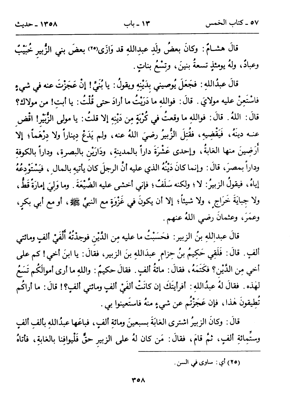قالَ عبداِللهِ بنُ الزبير: فحَسَبْتُ ما عليه مِن الديْنِ فوجدْتُهُ أَلْفَيْ ألفٍ ومائتي ألفٍ. قالَ: فَلَقِي حَكِيمُ بنُ حِزامٍ عبدَ اللهِ بنَ الزبير، فقالَ: يا ابنَ أخي! كم على أخي مِن الدَّيْنِ؟ فكَتَمَهُ، فقالَ: مائةُ ألفٍ. فقالَ حكيمٌ: واللهِ ما أرى أموالَكُم تَسَعُ لهذه. فقالَ لهُ عبدُ اللهِ: أفرأيتَكَ إن كانَتْ ألفَيْ ألفٍ ومائتي ألفٍ؟! قالَ: ما أراكُم تُطِيقونَ هذا، فإن عَجَزْتُم عن شيءٍ منهُ فاستَعينوا بي.