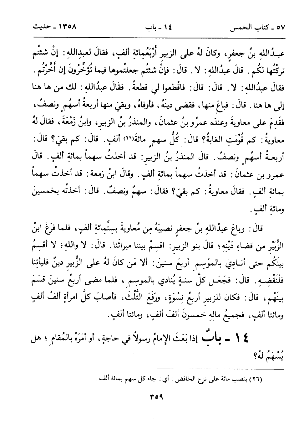 14 - بابٌ إذا بَعَثَ الإِمامُ رسولاً في حاجةٍ، أو أمَرَهُ بالمُقامِ؛ هل يُسْهَمُ لهُ؟