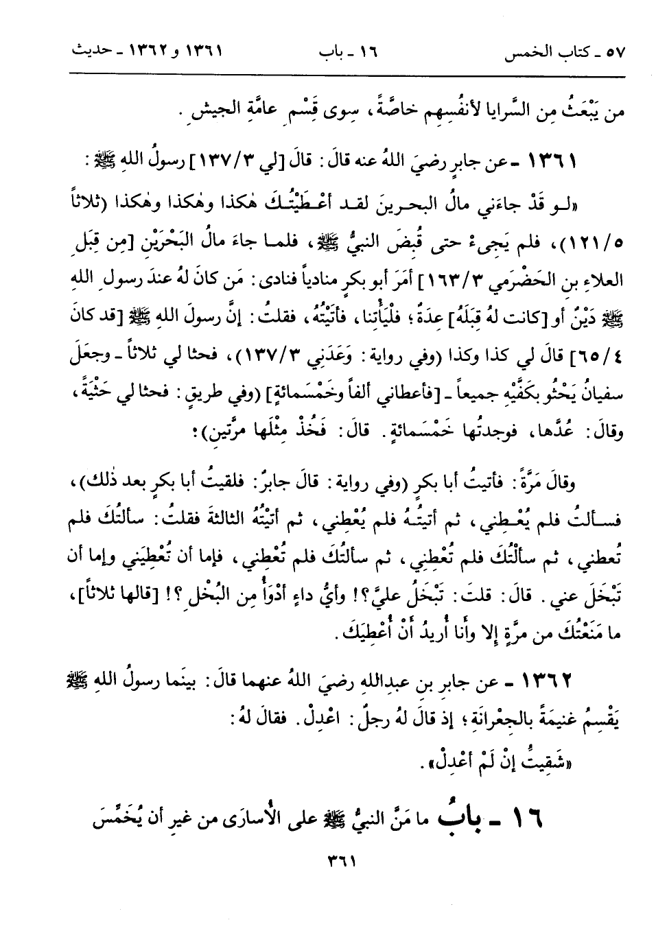 1362 - عن جابرِ بنِ عبدِ اللهِ رضيَ اللهُ عنهما قالَ: بينَما رسولُ اللهِ - صلى الله عليه وسلم - يَقْسِمُ غنيمَةً بالجِعْرانَةِ؛ إذ قالَ لهُ رجلٌ: اعْدِلْ. فقال لهُ: