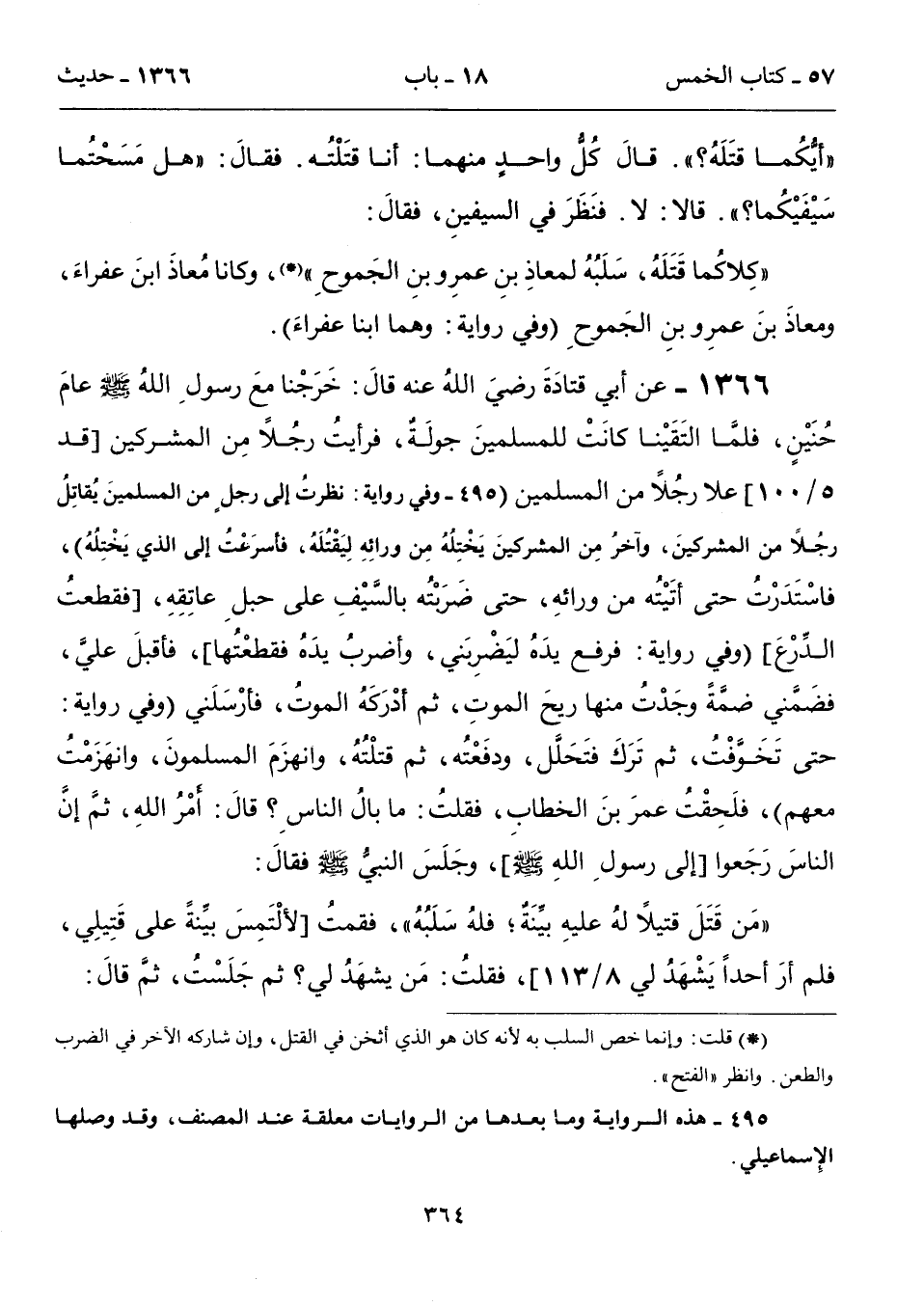 1366 - عن أبي قتادَةَ رضيَ اللهُ عنه قالَ: خَرَجْنا معَ رسولِ اللهِ - صلى الله عليه وسلم - عامَ حُنَيْنٍ، فلمَّا التَقَيْنا كانَتْ للمسلمينَ جولَةٌ، فرأيتُ رجُلاً مِن المشركين [قد 5/ 100] علا رجُلاً من المسلمين (495 - وفي روايةٍ: نظرتُ إلى رجل من المسلمينَ يُقاتِلُ رجُلاً من المشركينَ، وآخرُ مِن المشركينَ يَخْتِلُهُ مِن ورائِهِ لِيَقْتُلَهُ، فأسرَعْتُ إلى الذي يَخْتِلُهُ)، فاسْتَدَرْتُ حتى أتَيْتُه من ورائهِ، حتى ضَرَبْتُه بالسَّيْفِ على حبلِ عاتِقِهِ، [فقطعتُ الدِّرْعَ] (وفي روايةٍ: فرفع يدَهُ ليَضْرِبَني، وأضربُ يدَهُ فقطعْتُها]، فأقبلَ عليَّ، فضَمَّني ضمَّةً وجَدْتُ منها ريحَ الموتِ، ثم أدْرَكَهُ الموتُ، فأرْسَلَني (وفي روايةٍ: حتى تَخَوَّفْتُ، ثم تَرَكَ فتَحَلَّل، ودفَعْتُه، ثم قتلْتُهُ، وانهزَمَ المسلمونَ، وانهَزَمْتُ معهم)، فلَحِقْتُ عمرَ بنَ الخطابِ، فقلتُ: ما بالُ الناسِ؟ قالَ: أَمْرُ اللهِ، ثمَّ إنَّ الناسَ رَجَعوا [إلى رسولِ اللهِ - صلى الله عليه وسلم -]، وجَلَسَ النبيُّ - صلى الله عليه وسلم - فقالَ: