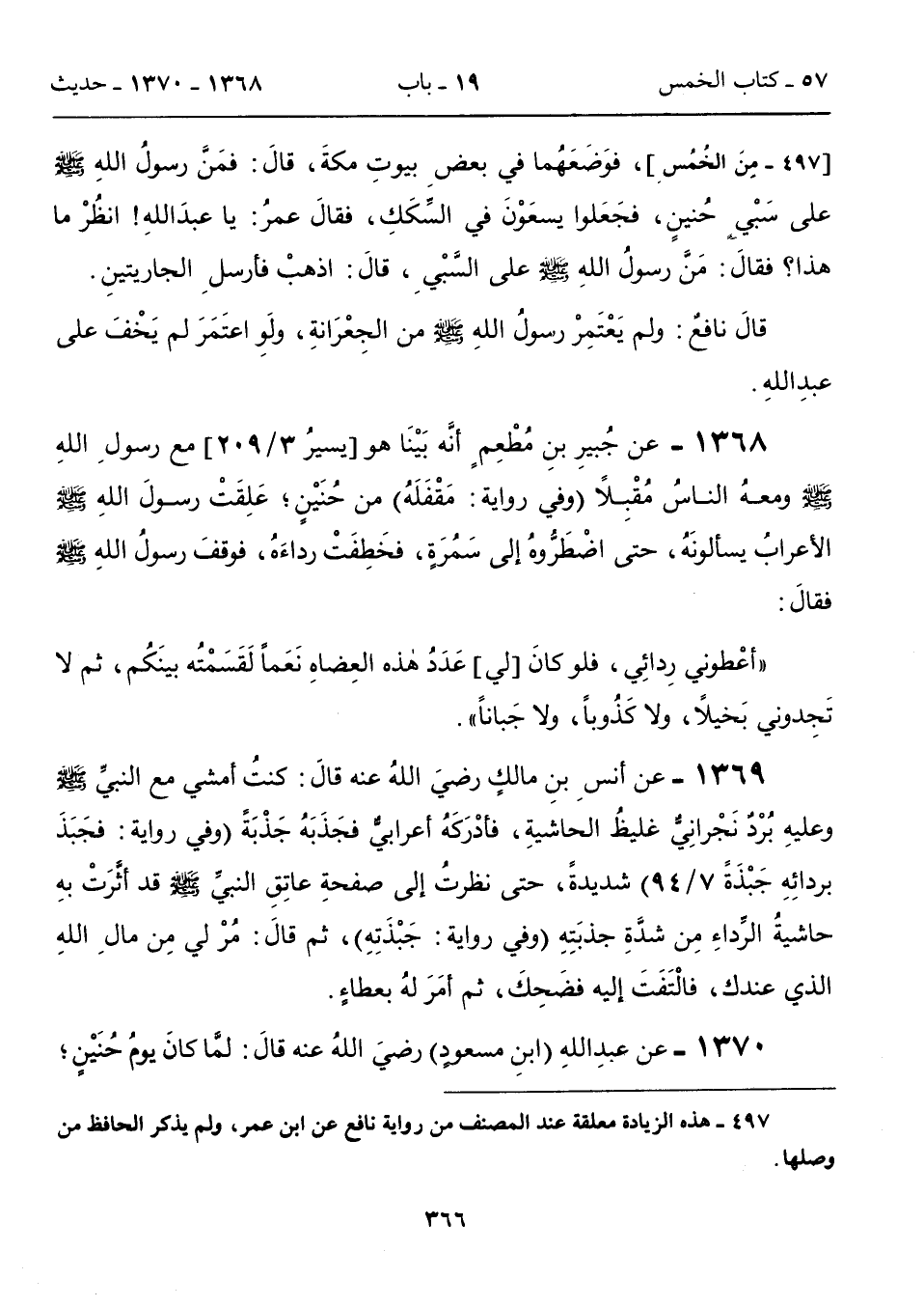 1368 - عن جُبيرِ بنِ مُطْعِمٍ أنَّه بَيْنَا هو [يسيرُ 3/ 209] مع رسولِ اللهِ - صلى الله عليه وسلم - ومعهُ الناسُ مُقْبِلاً (وفي روايةٍ: مَقْفَلَهُ) من حُنَيْنٍ؛ عَلِقَتْ رسولَ اللهِ - صلى الله عليه وسلم - الأعرابُ يسألونَهُ، حتى اضْطَرُّوهُ إلى سَمُرَةٍ، فخَطِفَتْ رداءَهُ، فوقفَ رسولُ اللهِ - صلى الله عليه وسلم - فقالَ: