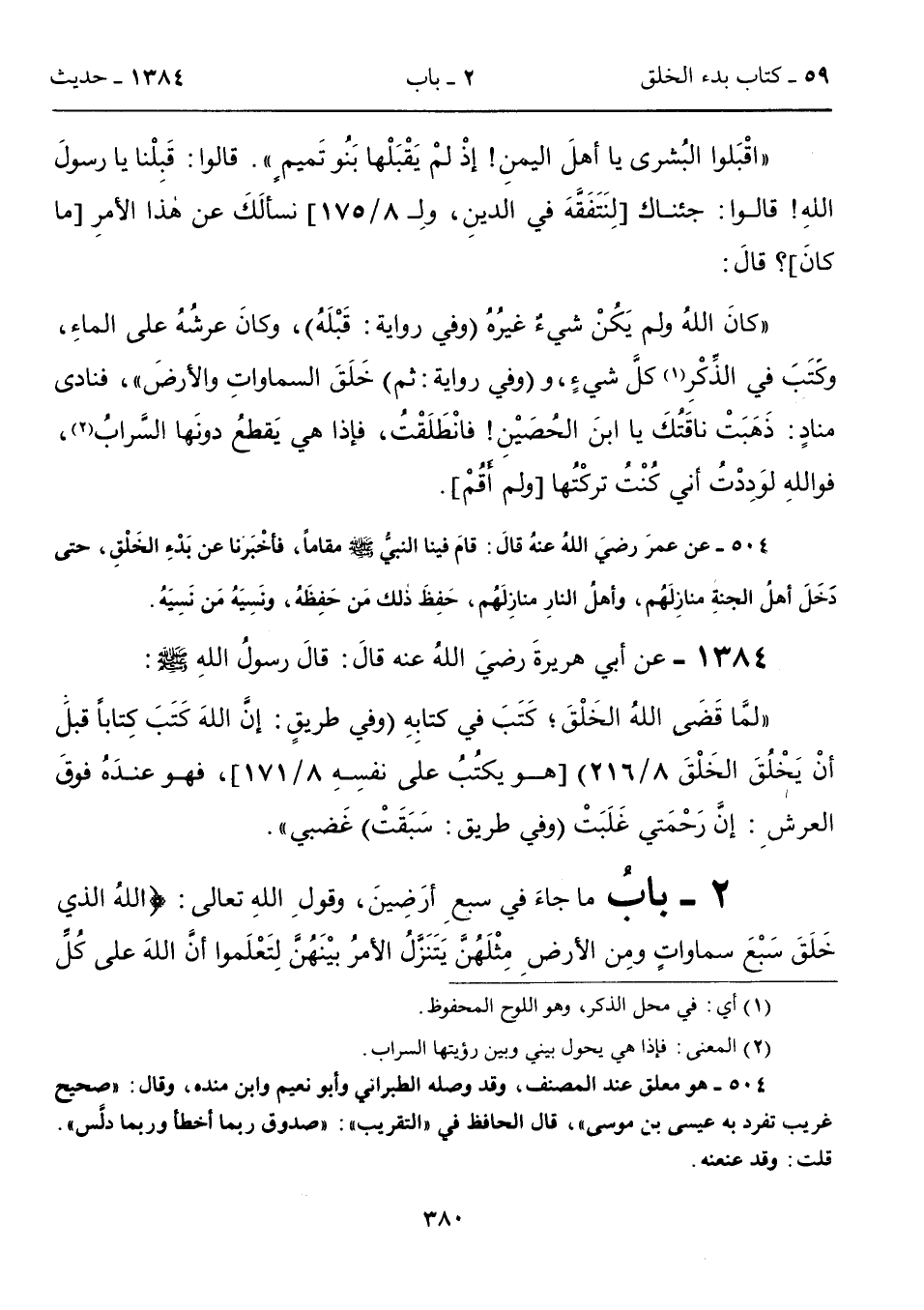 "كانَ اللهُ ولم يَكُنْ شيءٌ غيرُهُ (وفي روايةٍ: قَبْلَهُ)، وكانَ عرشُهُ على الماءِ، وكَتَبَ في الذِّكْرِ (1) كلَّ شيءٍ، و (وفي روايةٍ: ثم) خَلَقَ السماواتِ والأرضَ"، فنادى منادٍ: ذَهَبَتْ ناقَتُكَ يا ابنَ الحُصَيْنِ! فانْطَلَقْتُ، فإذا هي يَقطعُ دونَها السَّرابُ (2)، فواللهِ لوَدِدْتُ أني كُنْتُ تركْتُها [ولم أَقُمْ].