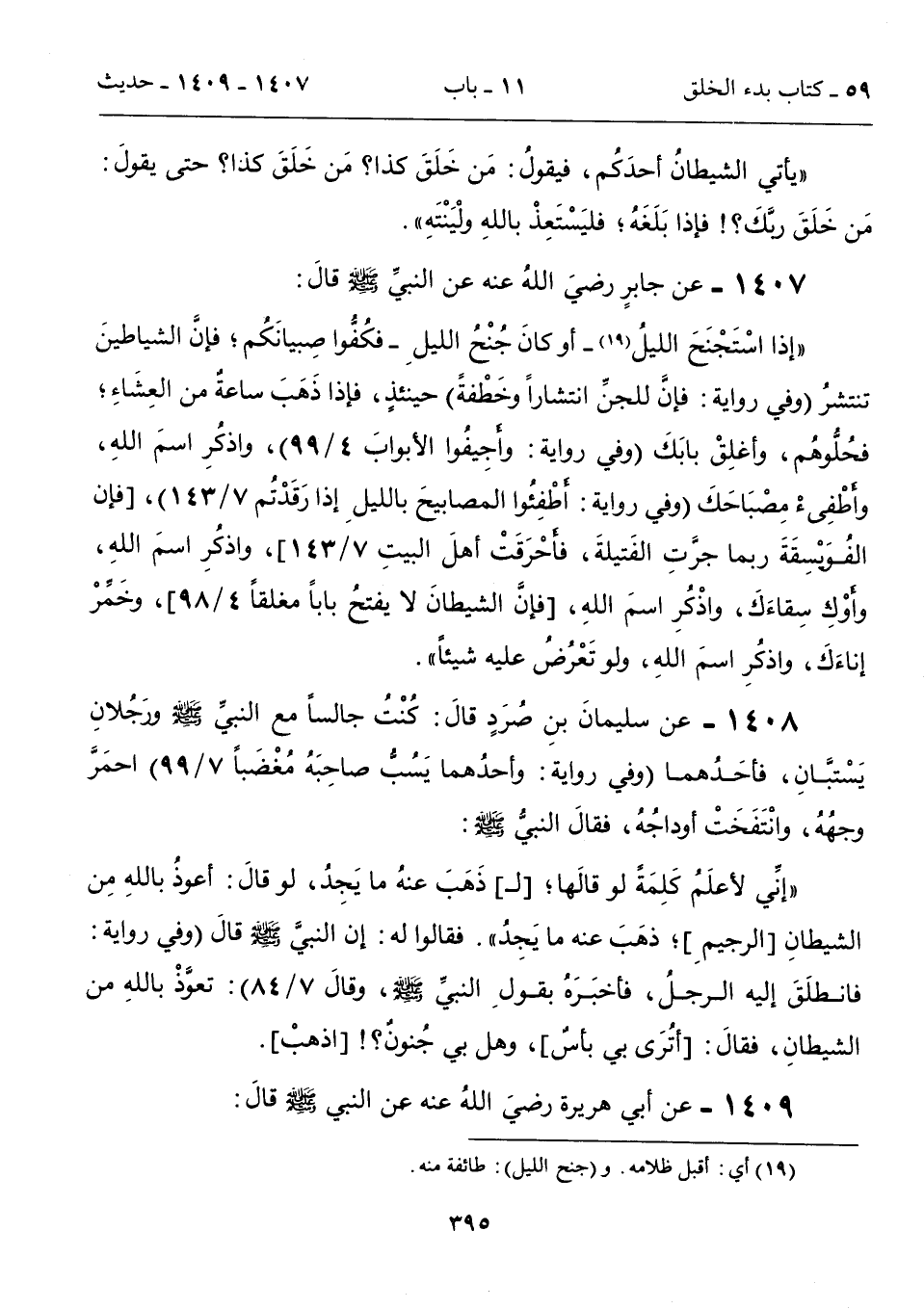 "إذا اسْتَجْنَحَ الليلُ (19) - أو كانَ جُنْحُ الليلِ- فكُفُّوا صِبيانَكُم؛ فإنَّ الشياطينَ تنتشرُ (وفي روايةٍ: فإنَّ للجنِّ انتشاراً وخَطْفةً) حينئذٍ، فإذا ذَهَبَ ساعةٌ من العِشَاءِ؛ فحُلُّوهُم، وأغلِقْ بابَكَ (وفي روايةٍ: وأَجِيفُوا الأبوابَ 4/ 99)، واذكُرِ اسمَ اللهِ، وأَطْفِىءْ مِصْبَاحَكَ (وفي روايةٍ: أَطْفِئُوا المصابيحَ بالليلِ إذا رَقَدْتُم 7/ 143)، [فإن الفُوَيْسِقَةَ ربما جرَّتِ الفَتيلةَ، فأَحْرَقَتْ أهلَ البيتِ 7/ 143]، واذكُرِ اسمَ اللهِ، وأَوْكِ سِقاءَكَ، واذْكُرِ اسمَ اللهِ، [فإنَّ الشيطانَ لا يفتحُ باباً مغلقاً 4/ 98]، وخَمِّرْ إناءَكَ، واذكُرِ اسمَ اللهِ، ولو تَعْرُضُ عليه شيئاً".