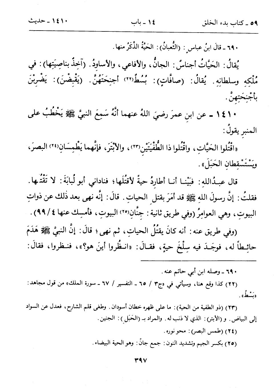 "اقْتُلوا الحَيَّاتِ، واقْتُلوا ذا الطُّفْيَتَيْنِ (23)، والأبْتَرَ، فإنَّهما يَطْمِسَانِ (24) البصرَ، ويَسْتَسْقِطانِ الحَبَلَ".