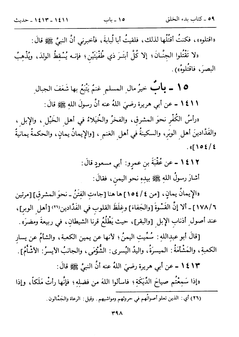 "الِإيمانُ يمانٍ، [من 4/ 154] ها هنا [جاءتِ الفِتَنُ- نحوَ المشرقِ] [مرتين 6/ 178]- ألا إنَّ القَسْوةَ [والجَفاءَ] وغِلَظَ القلوبِ في الفَدَّادين (26) [أهلِ الوبرِ]، عند أصولِ أذنابِ الإِبلِ [والبقر]، حيث يَطْلُعُ قرنا الشيطانِ، في ربيعةَ ومضرَ".
