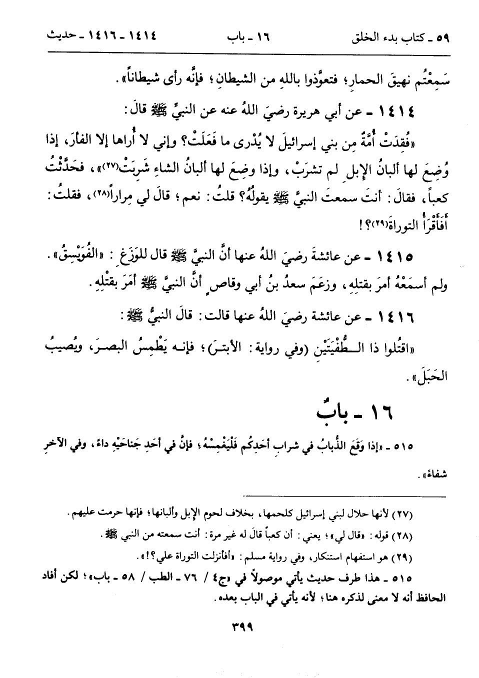 "فُقِدَتْ أُمَّةٌ مِن بني إسرائيلَ لا يُدْرى ما فَعَلَتْ؟ وإني لا أُراها إلا الفأرَ، إذا وُضِعَ لها ألبانُ الإبلِ لم تشرَبْ، وإذا وضِعَ لها ألبانُ الشاءِ شَرِبَتْ (27) "، فحَدَّثْتُ كعباً، فقالَ: أنتَ سمعتَ النبيَّ - صلى الله عليه وسلم - يقولُهُ؟ قلتُ: نعم؛ قالَ لي مِراراً (28)، فقلتُ: أفَأقْرَأُ التوراةَ (29)؟!