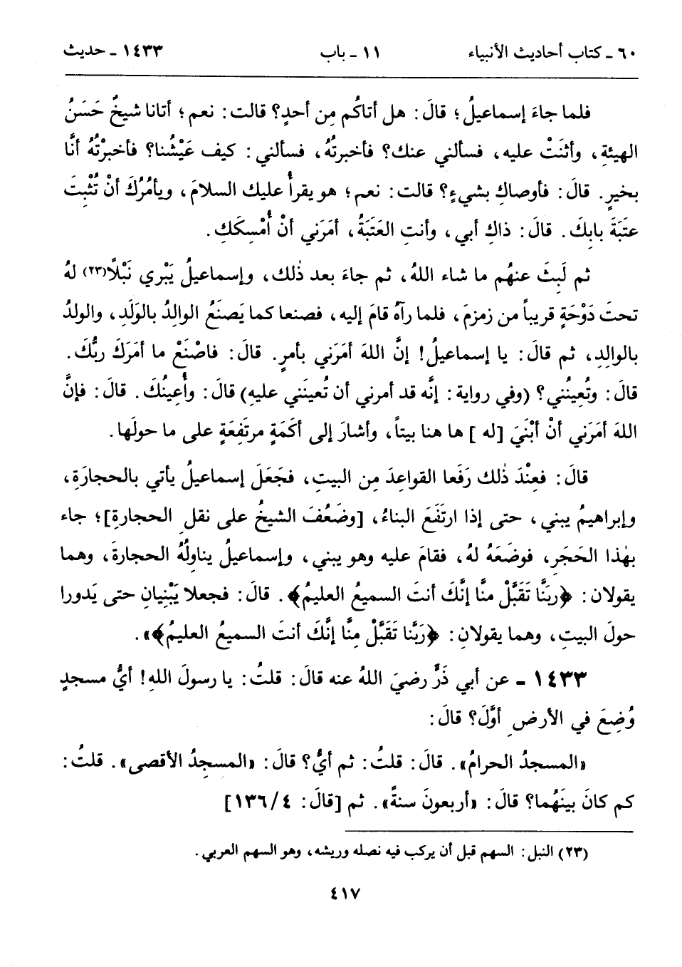 فلما جاءَ إسماعيلُ؛ قالَ: هل أتاكُم مِن أحدٍ؟ قالت: نعم؛ أتانا شيخٌ حَسَنُ الهيئةِ، وأثنَتْ عليه، فسألني عنك؟ فأخبرتُهُ، فسألني: كيف عَيْشُنا؟ فأخبرْتُهُ أنَّا بخيرٍ. قالَ: فأوصاكِ بشيءٍ؟ قالت: نعم؛ هو يقرأُ عليك السلامَ، ويأمُرُكَ أنْ تُثْبِتَ عتَبَةَ بابِكَ. قالَ: ذاكِ أبي، وأنتِ العَتَبَةُ، أمَرَني أنْ أُمْسِكَكِ. ثم لَبِثَ عنهُم ما شاء اللهُ، ثم جاءَ بعد ذلك، وإسماعيلُ يَبْري نَبْلاً (23) لهُ تحتَ دَوْحَةٍ قريباً من زمزمَ، فلما رآهُ قامَ إليه، فصنعا كما يَصنَعُ الوالِدُ بالوَلَدِ، والولدُ بالوالِدِ، ثم قالَ: يا إسماعيلُ! إنَّ اللهَ أمَرَني بأمرٍ. قالَ: فاصْنَعْ ما أمَرَكَ ربُّكَ. قالَ: وتُعِينُني؟ (وفي روايةٍ: إنَّه قد أمرني أن تُعينَني عليهِ) قالَ: وأُعِينُكَ. قالَ: فإنَّ اللهَ أمَرَني أنْ أبْنيَ [له] ها هنا بيتاً، وأشارَ إلى أكَمَةٍ مرتَفِعَةٍ على ما حولَها.