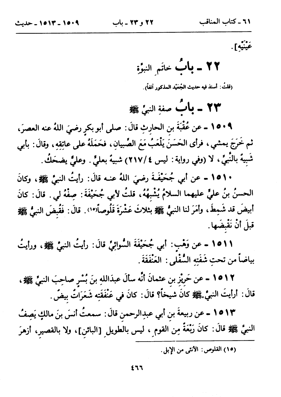 1510 - عن أبي جُحَيْفةَ رضيَ اللهُ عنه قالَ: رأيتُ النبي - صلى الله عليه وسلم -، وكانَ الحسنُ بنُ علي عليهما السلامُ يُشْبِهُهُ، قلتُ لأبي جُحَيْفةَ: صِفْهُ لي. قالَ: كانَ أبيض قد شَمِطَ، وأمَرَ لنا النبي - صلى الله عليه وسلم - بثلاثَ عَشْرَةَ قَلُوصاً (15). قالَ: فَقُبضَ النبي - صلى الله عليه وسلم - قبلَ أنْ نَقْبِضَها.