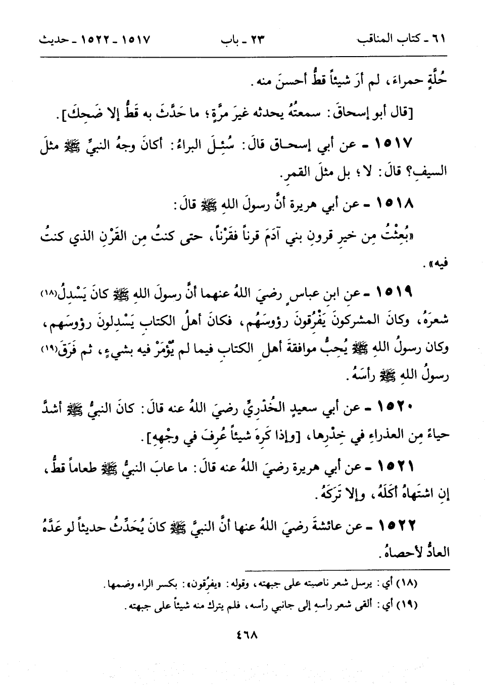 1517 - عن أبي إسحاق قالَ: سُئِلَ البراءُ: أكانَ وجهُ النبي - صلى الله عليه وسلم - مثلَ السيفِ؟ قالَ: لا؛ بل مثلَ القمرِ.