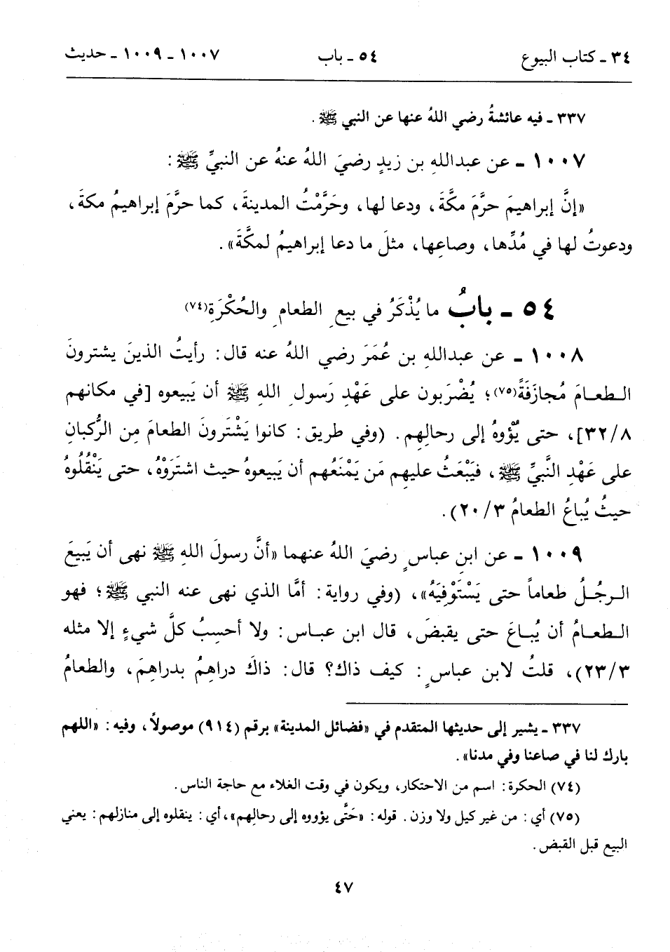 1008 - عن عبد اللهِ بن عُمَرَ رضي اللهُ عنه قال: رأيتُ الذينَ يشترونَ الطعامَ مُجازَفَةً (75)؛ يُضْرَبون على عَهْدِ رَسولِ اللهِ - صلى الله عليه وسلم - أن يَبيعوه [في مكانهم 8/ 32]، حتى يُؤْوهُ إلى رحالِهِم. (وفي طريق: كانوا يَشْتَرونَ الطعامَ مِن الرُّكبانِ على عَهْدِ النَّبيِّ - صلى الله عليه وسلم -، فيَبْعَثُ عليهِم مَن يَمْنَعُهم أن يَبيعوه حيث اشتَرَوْهُ، حتى يَنْقُلُوهُ حيثُ يُباعُ الطعامُ 3/ 20).