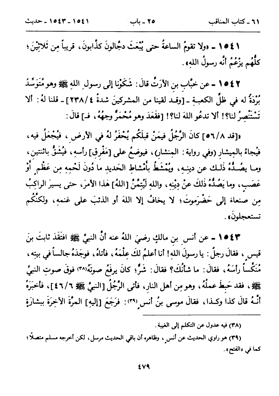 1542 - عن خبَّابِ بنِ الأرَتِّ قالَ: شَكَوْنا إلى رسولِ اللهِ - صلى الله عليه وسلم - وهو مُتَوَسِّدٌ بُرْدَةً له في ظلِّ الكعبةِ -[وقد لقينا من المشركينَ شدةً 4/ 238]- قلنا لهُ: ألا تَسْتَنْصِرُ لنا؟! ألا تدعُو اللهَ لنا؟! [فقَعَدَ وهو مُحْمَرٌّ وجهُهُ، فـ] قالَ: