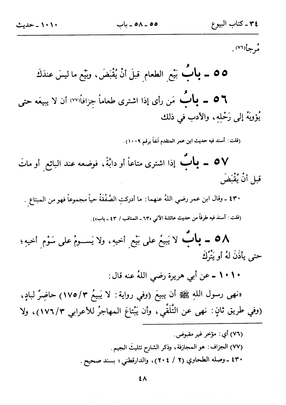 56 - بابُ مَن رأى إذا اشترى طعاماً جِزافاً (77) أن لا يبيعَه حتى