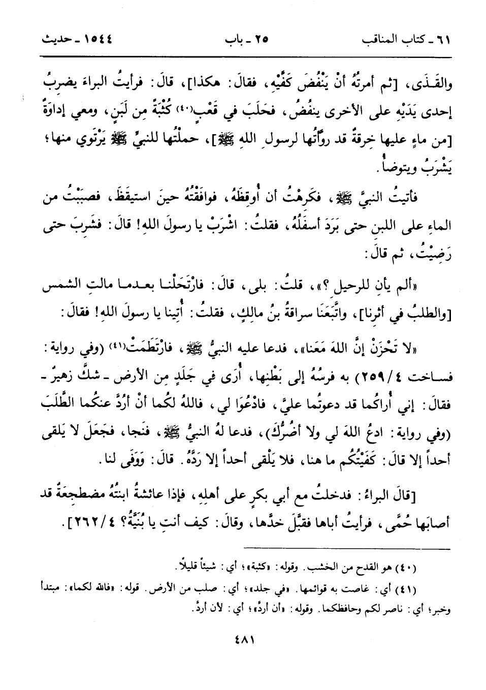 "ألم يانِ للرحيلِ؟ "، قلتُ: بلى، قالَ: فارْتَحَلْنا بعدما مالتِ الشمس [الطلبُ في أثرِنا]، واتَّبَعَنَا سراقةً بنُ مالِكٍ، فقلتُ: أُتِينا يا رسولَ اللهِ! فقالَ: