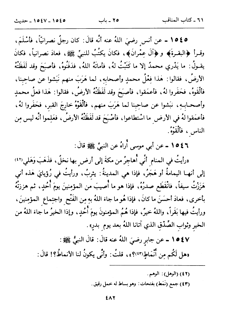 1546 - عن أبىِ موسى أُراهُ عن النبي - صلى الله عليه وسلم - قالَ: "رأيتُ في المنامِ أنِّي أُهاجِرُ من مكةَ إلى أرضٍ بها نخلٌ، فذَهَبَ وَهَلي (42) إلى أنها اليمامةُ أو هَجَرُ، فإذا هي المدينةُ: يثرِبُ، ورأيتُ في رُؤيايَ هذه أني هَزَزْتُ سيفاً، فانْقَطَع صدرُهُ، فإذا هو ما أُصيبَ من المؤمِنينَ يومَ أُحُدٍ، ثم هززتُهُ بأخرى، فعادَ أحسَنَ ما كانَ، فإذا هُو ما جاءَ اللهُ بهِ مِن الفَتْحِ واجتِماعِ المؤمِنينَ، ورأيتُ فيها بَقَراً، واللهُ خيرٌ، فإذا هُمُ المؤمنونَ يومَ أُحُدٍ، وإذا الخيرُ ما جاءَ اللهُ من الخيرِ وثوابِ الصِّدْقِ الذي آتانا اللهُ بعد يومِ بدرٍ".