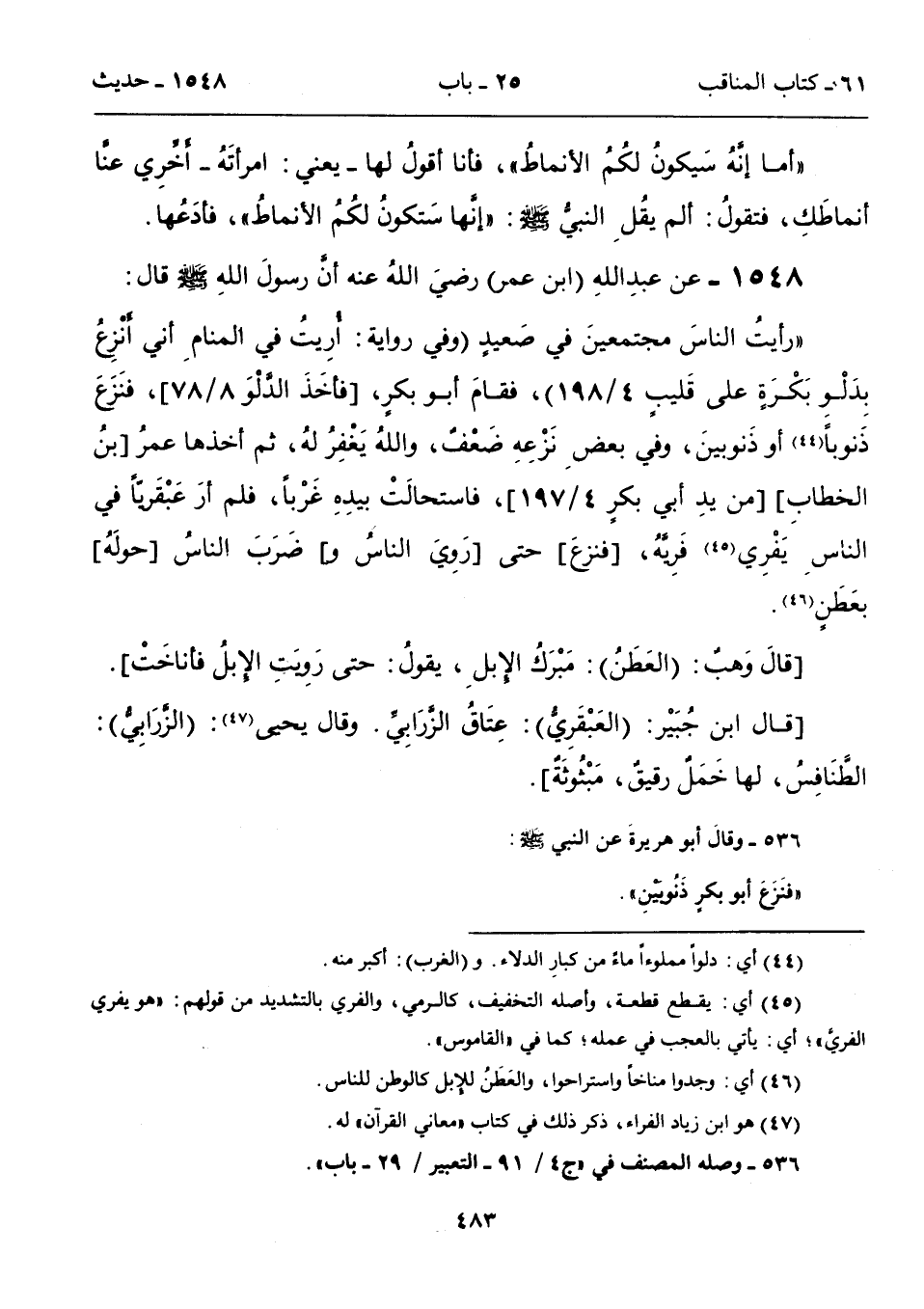 1548 - عن عبدِ اللهِ (ابن عمر) رضيَ اللهُ عنه أن رسولَ اللهِ - صلى الله عليه وسلم - قال: "رأيتُ الناسَ مجتمعينَ في صَعيدٍ (وفي روايةٍ: أرِيتُ في المنامِ أني أنْزِعُ بِدَلْو بَكرَةٍ على قَليبٍ 4/ 198)، فقامَ أبو بكرٍ، [فأخَذَ الدّلْوَ 8/ 78]، فنَزَعَ ذَنوبًا (44) أو ذَنوبينَ، وفي بعضِ نَزْعِهِ ضَعْفٌ، واللهُ يَغْفِرُ لهُ، ثم أخذها عمرُ [بنُ الخطابِ]، [من يدِ أبي بكرٍ 4/ 197]، فاستحالَتْ بيدِهِ غَرْباً، فلم أرَ عَبْقَرباً في الناسِ يَفْرِي (45) فَرِيَّهُ، [فنزع]، حتى [رَوِيَ الناسُ و] ضَرَبَ الناسُ [حولَهُ]، بعَطَنٍ (46).