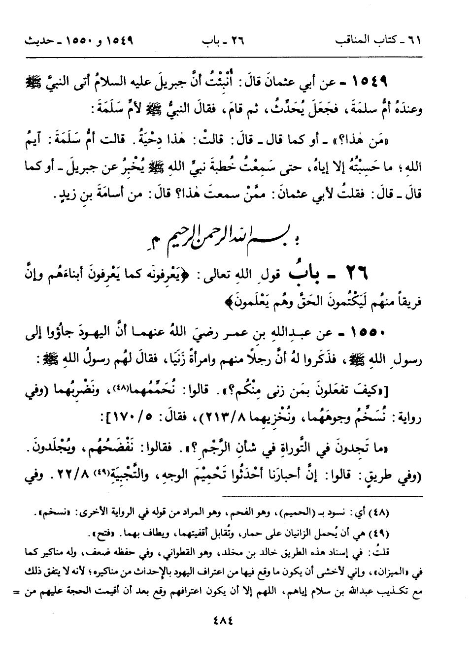 "ما تَجِدونَ في التوراةِ في شأنِ الرجْمِ؟ ". فقالوا: نَفْضَحُهُم، ويُجْلَدونَ. (وفي طريقٍ: قالوا: إن أحبارَنا أحْدَثُوا تَحْمِيْمَ الوجهِ، والتَّجْبِيَةِ (49) 8/ 22. وفي