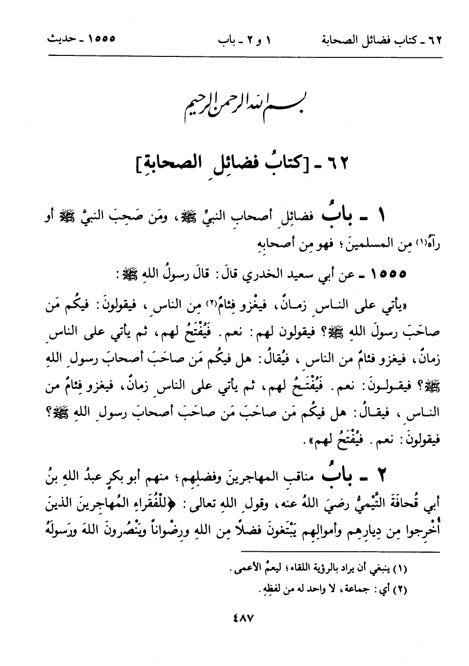 1 - بابُ فضائِلِ أصحابِ النبيِّ - صلى الله عليه وسلم -، ومَن صَحِبَ النبيَّ - صلى الله عليه وسلم - رآه (1) مِن المسلمينَ؛ فهو مِن أصحابِهِ