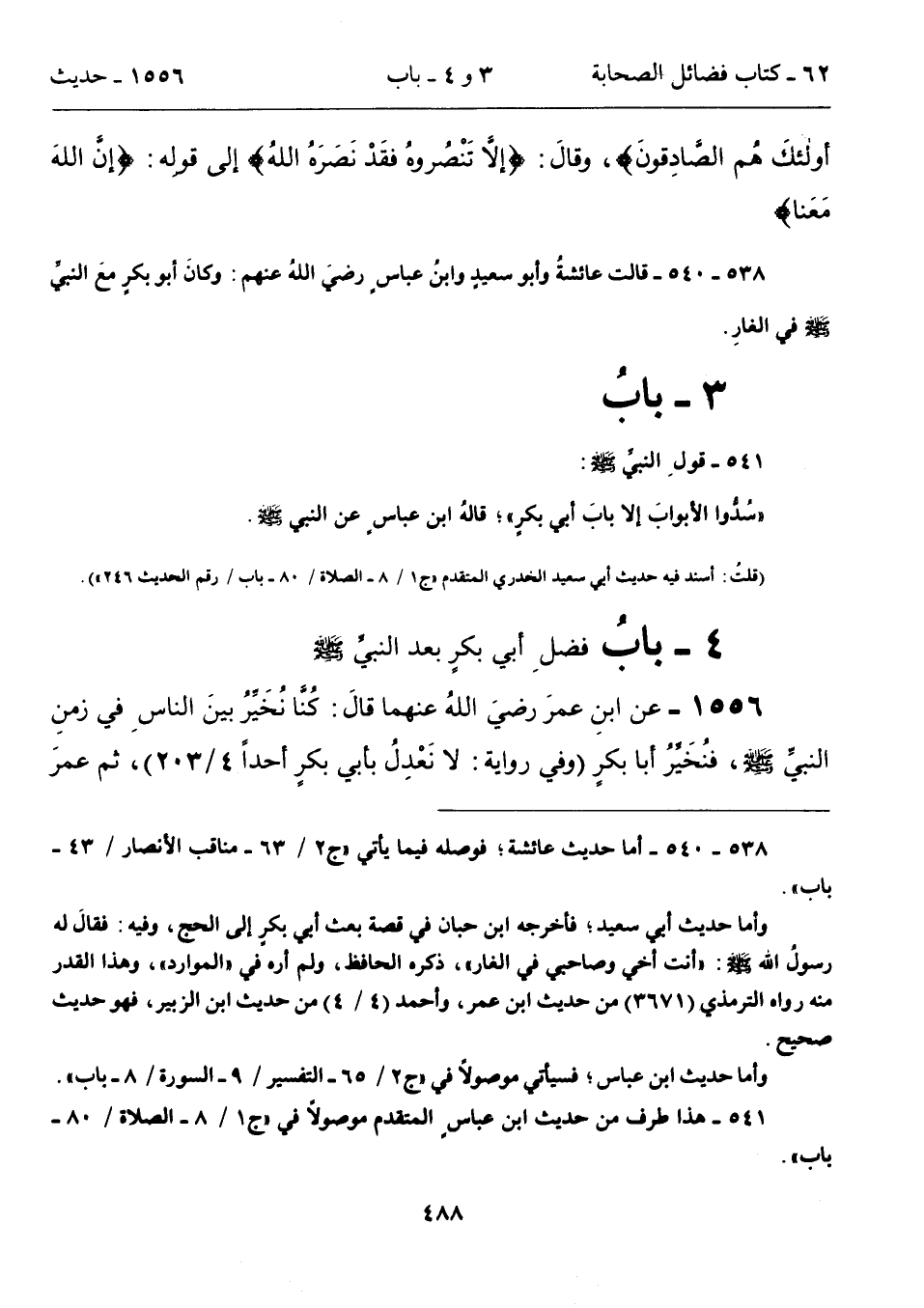 1556 - عن ابنِ عمرَ رضيَ اللهُ عنهما قال: كُنَّا نُخَيِّرُ بينَ الناسِ في زمنِ النبيِّ - صلى الله عليه وسلم - فُنَخَيِّرُ أبا بكرٍ (وفي روايةٍ: لا نَعْدِلُ بأبي بكرٍ أحداً 4/ 203)، ثم عمرَ