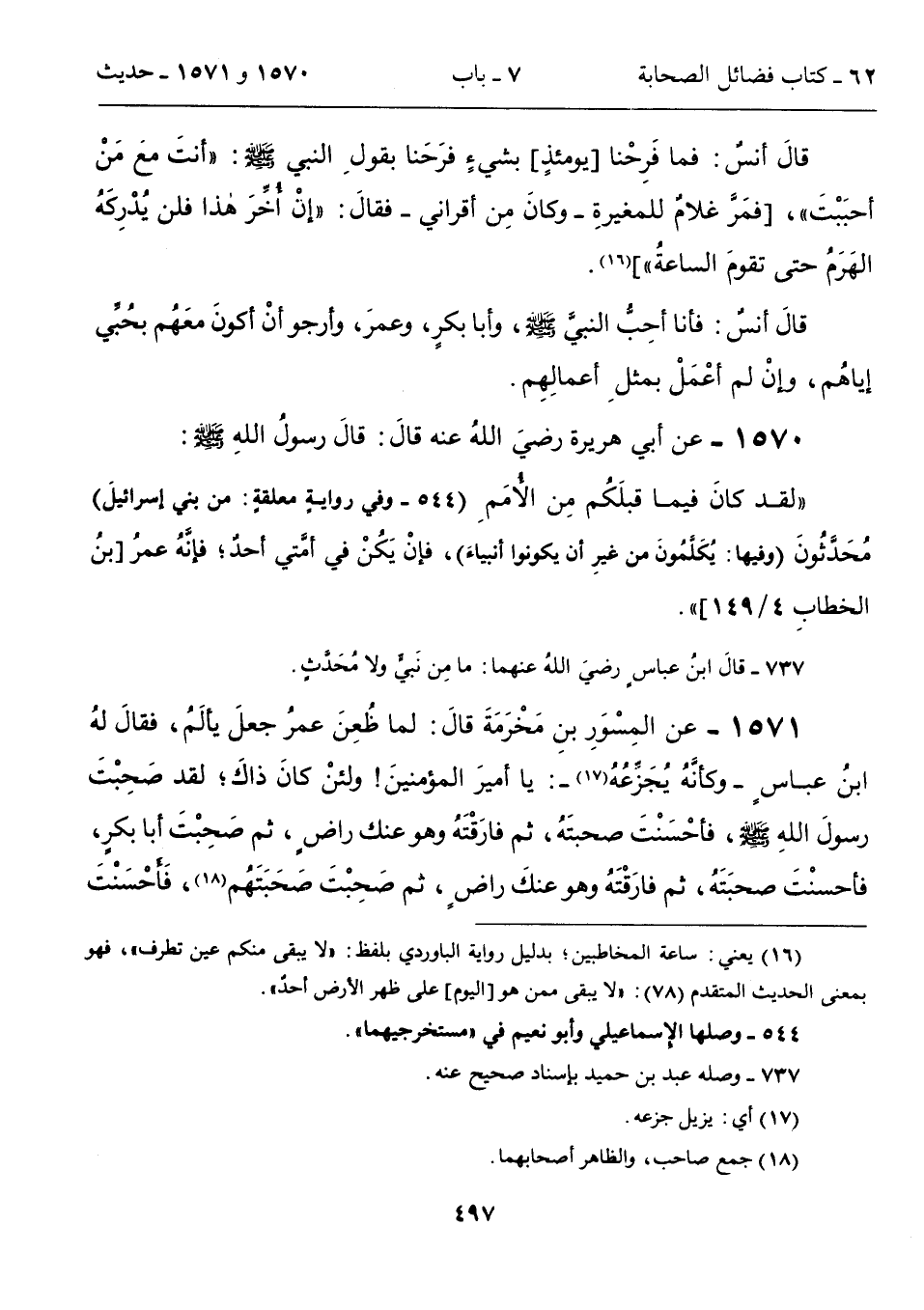 1571 - عن المِسْوَرِ بنِ مَخْرَمَةَ قالَ: لما طُعِنَ عمرُ جعل يألَمُ، فقالَ لهُ ابنُ عباس -وكأنَّهُ يُجَزِّعُهُ (17) -: يا أميرَ المؤمنينَ! ولئنْ كانَ ذاكَ؛ لقد صَحِبْتَ رسولَ اللهِ - صلى الله عليه وسلم -، فأحْسَنْتَ صحبتَهُ، ثم فارَقْتَهُ وهو عنك راضٍ، ثم صَحِبْتَ أبا بكرٍ، فأحسنْتَ صحبَتَهُ، ثم فارَقْتَهُ وهو عنكَ راضٍ، ثم صَحِبْتَ صَحَبَتَهُم (18)، فَأحْسَنْتَ