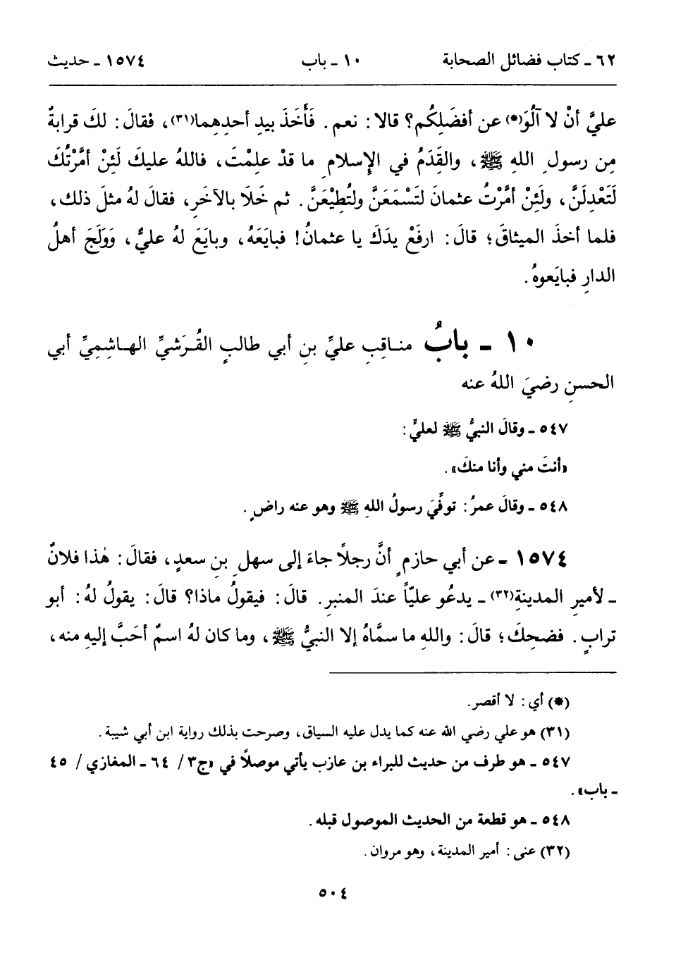548 - وقالَ عمرُ: توفِّيَ رسولُ اللهِ - صلى الله عليه وسلم - وهو عنه راضٍ. 1574 - عن أبي حازم أنَّ رجلاً جاءَ إلى سهلِ بنِ سعدٍ، فقالَ: هذا فلانٌ -لأميرِ المدينةِ (32) - يدعُو عليًّا عندَ المنبرِ. قالَ: فيقولُ ماذا؟ قالَ: يقولُ لهُ: أبو ترابٍ. فضحِكَ؛ قالَ: واللهِ ما سمَّاهُ إلا النبيُّ - صلى الله عليه وسلم -، وما كان لهُ اسمٌ أحَبَّ إليهِ منه،