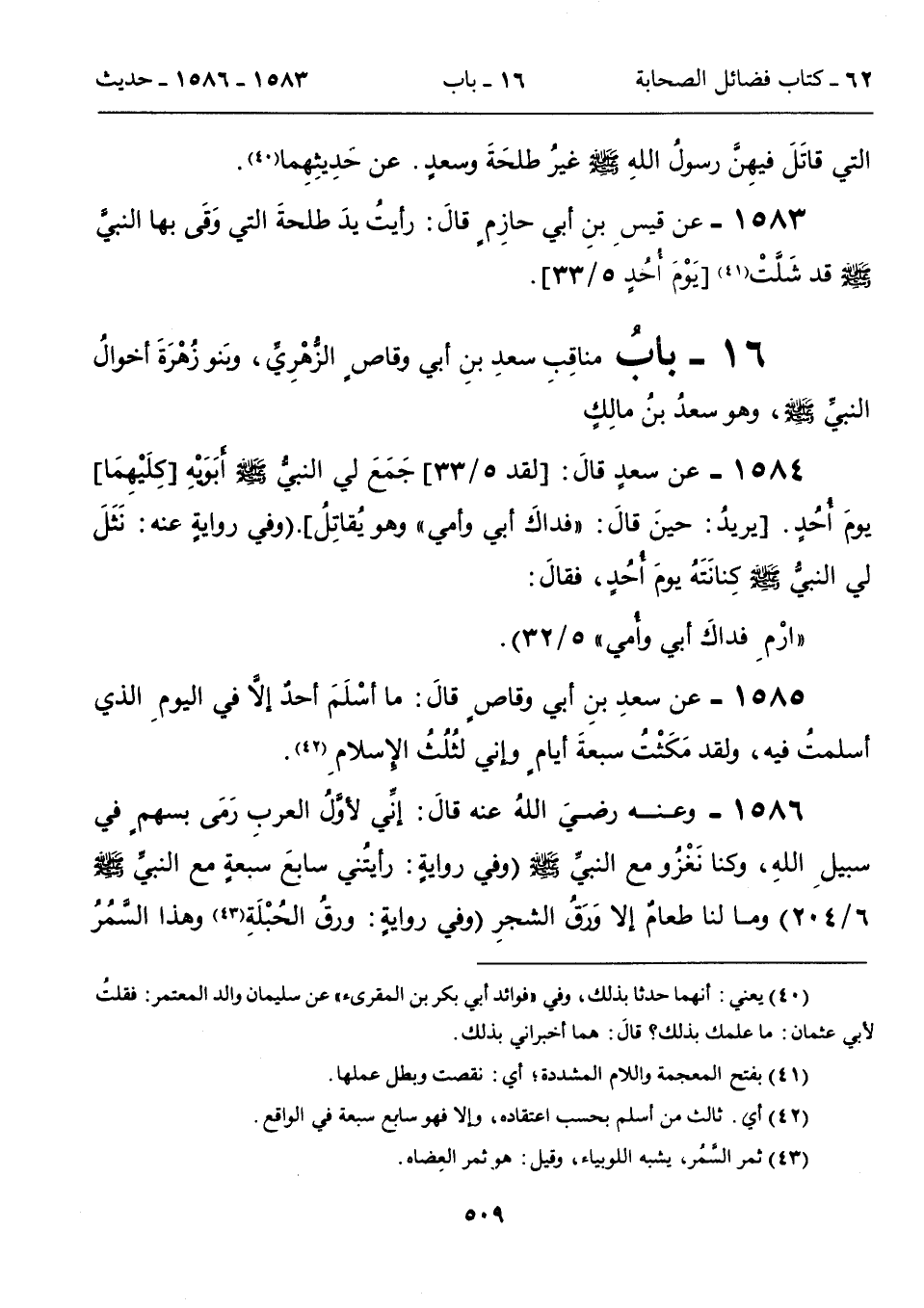 1584 - عن سعدٍ قالَ: [لقد 5/ 33]، جَمَعَ لي النبيُّ - صلى الله عليه وسلم - أبَوَيْهِ [كِلَيْهِمَا] يومَ أُحُدٍ. [يريدُ: حينَ قالَ: "فداكَ أبي وأمي" وهو يُقاتِلُ". (وفي روايةٍ عنه: نَثَلَ لي النبيُّ - صلى الله عليه وسلم - كِنانَتَهُ يومَ أُحُدٍ، فقالَ: