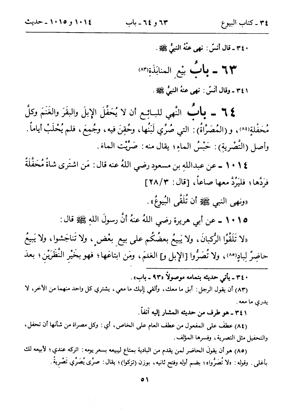 "لا تَلَقَّوُا الرُّكبانَ، ولايَبيعُ بعضُكُم على بيعِ بعْضٍ، ولاتَناجَشوا، ولا يَبيعُ حاضِرٌ لِبادٍ (85)، ولا تُصَرُّوا [الِإبل و] الغنمَ، ومَن ابتاعَها؛ فهو بخَيْرِ النَّظَرَيْنِ؛ بعدَ