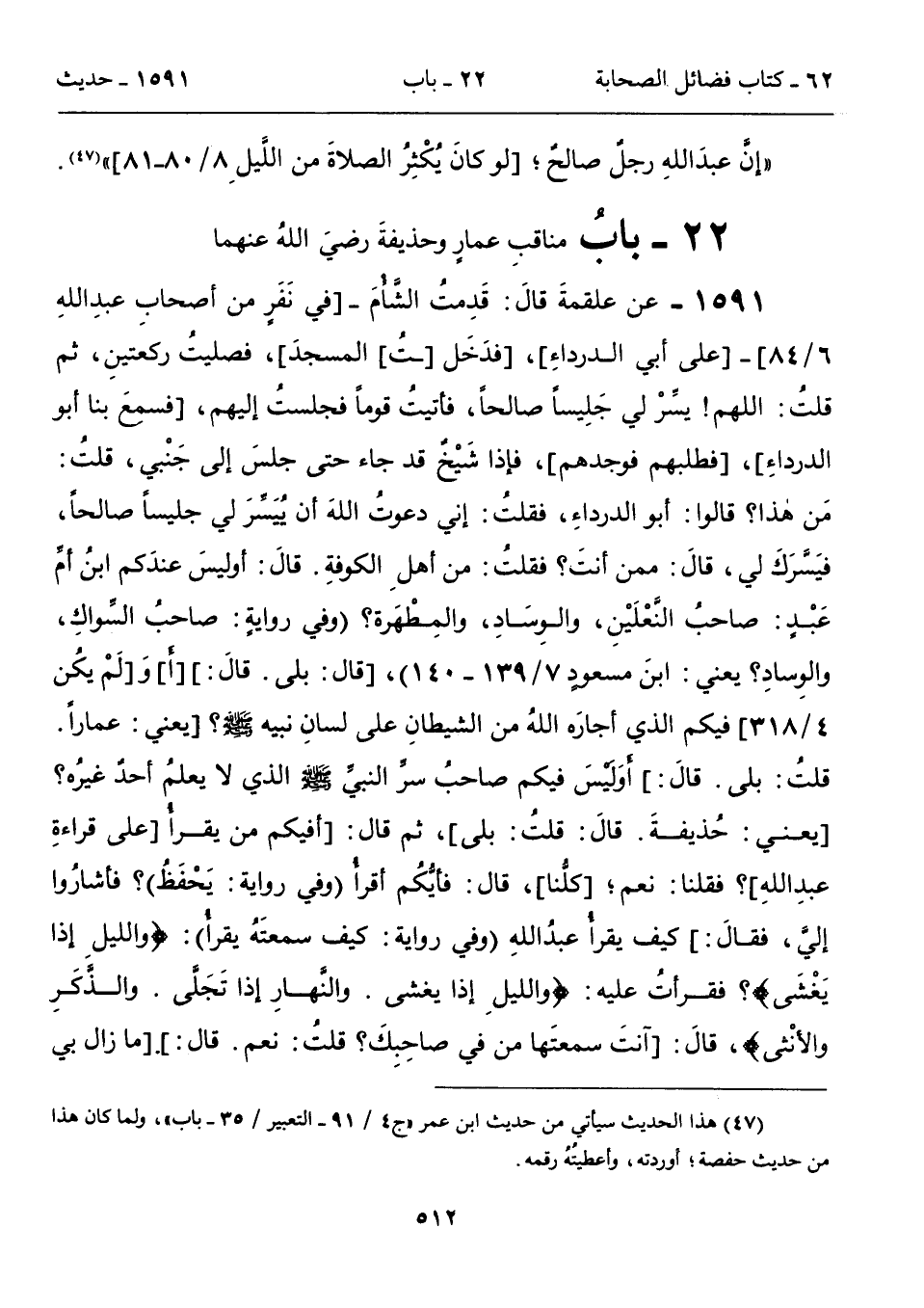 1591 - عن علقمةَ قالَ: قَدِمتُ الشَّامَ -[في نَفَرٍ من أصحابِ عبدِ اللهِ 6/ 84]-[على أبي الدرداءِ]، [فدَخَل [ـتُ] المسجدَ]، فصليتُ ركعتينِ، ثم قلتُ: اللهم! يسرْ لي جَلِيساً صالحاً، فأتيتُ قوماً فجلستُ إليهم، [فسمعَ بنا أبو الدرداءِ]، [فطلبهم فوجدهم] فإذا شَيْخٌ قد جاء حتى جلسَ إلى جَنْبي، قلتُ: مَن هذا؟ قالوا: أبو الدرداءِ، فقلتُ: إني دعوتُ اللهَ أن يُيَسِّرَ لي جليساً صالحاً، فيَسَّرَكَ لي، قالَ: ممن أنت؟ فقلتُ: من أهلِ الكوفةِ. قالَ: أوليسَ عندَكم ابنُ أم عَبْدٍ: صاحبُ النَّعْلَيْنِ، والوِسَادِ، والمِطْهَرة؟ (وفي روايةٍ: صاحبُ السِّواكِ، والوِسادِ؟ يعني: ابنَ مسعود 7/ 139 - 140)، [قال: بلى. قالَ:] [أَ] وَ [لَمْ يكُن 4/ 318]، فيكم الذي أجارَه اللهُ من الشيطانِ على لسانِ نبيه - صلى الله عليه وسلم -؟ [يعني: عماراً. قلتُ: بلى. قالَ:] أوَلَيْسَ فيكم صاحبُ سرِّ النبيِّ - صلى الله عليه وسلم - الذي لا يعلمُ أحدٌ غيرُه؟ [يعني: حُذيفةَ. قالَ: قلتُ: بلى]، ثم قال: [أفيكم من يقرأُ [على قراءةِ عبدِ اللهِ]؟ فقلنا: نعم؛ [كلُّنا]، قال: فأيُّكُم أقرأْ (وفي روايةٍ: يَحْفَظُ)؟ فأشارُوا إليَّ، فقالَ:] كيف يقرأ عبدُ اللهِ (وفي روايةٍ: كيف سمعتَهُ يقرأُ): {والليل إذا يَغْشَى}؟ فقرأتُ عليه: {وَاللَّيْلِ إِذَا يَغْشَى (1) وَالنَّهَارِ إِذَا تَجَلَّى (2) وَمَا خَلَقَ الذَّكَرَ وَالْأُنْثَى (3)} [الليل: 1 - 3]، قالَ: [آنتَ سمعتَها من في صاحِبِكَ؟ قلتُ: نعم. قال:] [ما زال بي