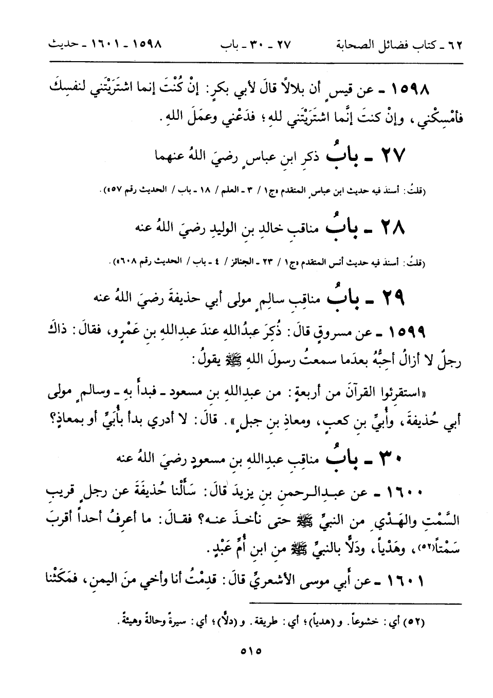 1600 - عن عبدِ الرحمنِ بنِ يزيدَ قالَ: سَألْنا حُذيفَةَ عن رجلٍ قريبِ السَّمْتِ والهَدْيِ من النبيِّ - صلى الله عليه وسلم - حتى نأخذَ عنه؟ فقالَ: ما أعرِفُ أحداً أقربَ سَمْتاً (52)، وهَدْياً، ودَلاًّ بالنبيِّ - صلى الله عليه وسلم - منِ ابنِ أُم عَبْدٍ.