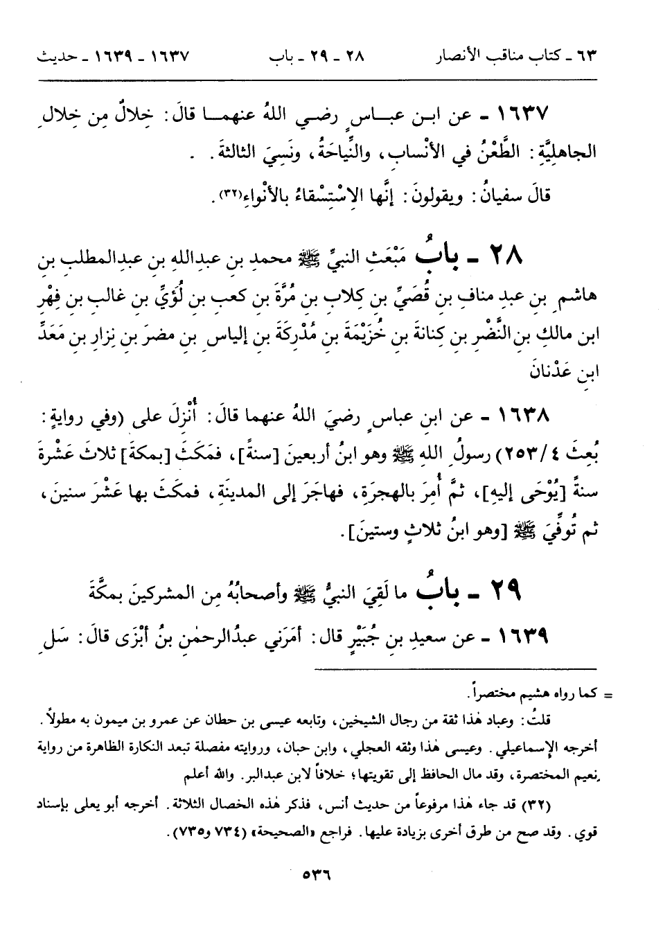 1638 - عن ابنِ عباسٍ رضي اللهُ عنهما قالَ: أُنْزِلَ على (وفي روايةٍ: بُعِثَ 4/ 253) رسولُ اللهِ - صلى الله عليه وسلم - وهو ابنُ أربعينَ [سنةً]، فمكَثَ [بمكةَ] ثلاثَ عَشْرةَ سنة [يُوْحَى إليهِ]، ثمَّ أُمِرَ بالهجرَةِ، فهاجَرَ إلى المدينَةِ، فمكَثَ بها عَشْرَ سنينَ، ثم تُوفِّيَ - صلى الله عليه وسلم -[وهو ابنُ ثلاثٍ وستينَ].