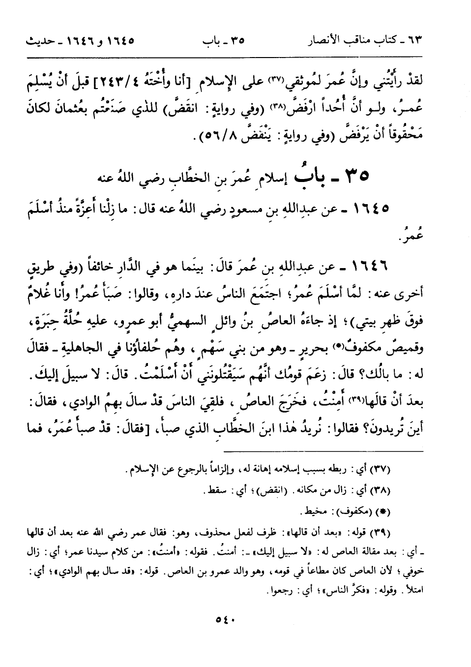 1646 - عن عبدِ اللهِ بنِ عُمرَ قالَ: بينَما هو في الدَّارِ خائفاً (وفي طريقٍ أخرى عنه: لمَّا أسْلَمَ عُمرُ؛ اجتَمَعَ الناسُ عندَ دارهِ، وقالوا: صَبَأَ عُمرُ! وأنا غُلامٌ فوقَ ظهرِ بيتي)؛ إذ جاءَهُ العاصِ بنُ وائلٍ السهميُّ أبو عمرٍو، عليهِ حُلَّةُ حِبَرةٍ، وقصيصٌ مكفوفٌ (*) بحريرٍ -وهو من بني سَهْمٍ، وهُم حُلفاؤُنا في الجاهليةِ- فقالَ له: ما بالُك؟ قالَ: زعَمَ قومُك أنَّهُم سَيَقْتُلونَني أنْ أسْلَمْتُ. قالَ: لا سبيلَ إليكَ. بعدَ أنْ قالَها (39) أَمِنْتُ، فخَرَجَ العاصِ، فلقِيَ الناسَ قدْ سالَ بهِمُ الوادي، فقالَ: أينَ تُريدونَ؟ فقالوا: نُريدُ هذا ابنَ الخطَّابِ الذي صبأَ، [فقالَ: قدْ صبأَ عُمَرُ، فما