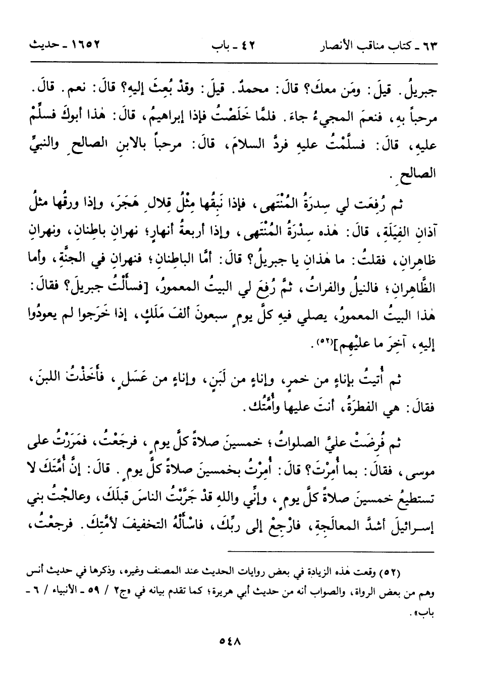 ثم رُفِعَت لي سِدرَةُ المُنْتَهى، فإذا نبِقُها مِثْلُ قِلالِ هَجَرَ، وإذا ورقُها مثلُ آذانِ الفِيَلَةِ، قالَ: هذه سِدْرَةُ المُنْتَهى، وإذا أربعةُ أنهارٍ؛ نهرانِ باطِنانِ، ونهرانِ ظاهِرانِ، فقلتُ: ما هذانِ يا جبريلُ؟ قالَ: أمّا الباطِنانِ؛ فنهرانِ في الجنَّةِ، وأما الظَّاهِرانِ؛ فالنيلُ والفراتُ، ثمَّ رُفِعَ لي البيتُ المعمورُ، [فسأَلْتُ جبريل؟ فقالَ: هذا البيتُ المعمورُ، يصلي فيهِ كلَّ يومٍ سبعونَ ألفَ مَلَكٍ، إذا خَرَجوا لم يعودُوا إليهِ، آخِرَ ما عليْهِم] (52).