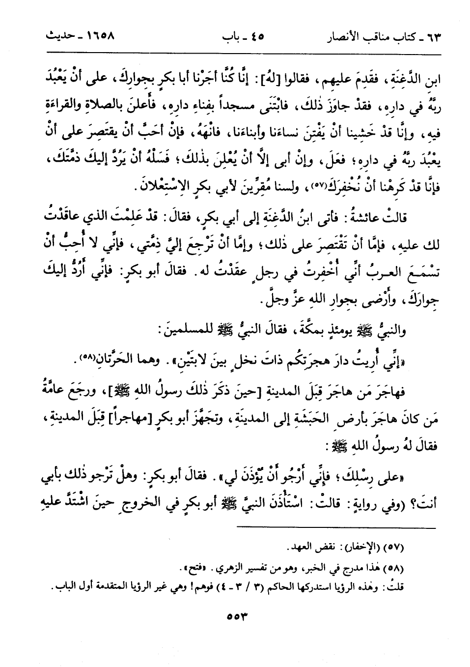 ابنِ الدَّغِنَةِ، فقَدِمَ عليهِم، فقالوا [لهُ]: إنَّا كُنا أجَرْنا أبا بكرٍ بجِوارِكَ، على أنْ يَعْبُدَ ربَّهُ في دارِهِ، فقدْ جاوَزَ ذلكَ، فابْتَنَى مسجداً بفِناءِ دارِهِ، فأعلنَ بالصلاةِ والقراءَةِ فيهِ، وإنَّا قدْ خَشِينا أنْ يَفْتِنَ نساءَنا وأبناءَنا، فانْهَهُ، فإنْ أحَبَّ أنْ يقتَصِرَ على أنْ يعْبُدَ ربَّهُ في دارِهِ؛ فعَلَ، وإنْ أبى إلاَّ أن يُعْلِنَ بذلكَ؛ فَسَلْهُ أنْ يَرُدَّ إليكَ ذمَّتَكَ، فإنَا قدْ كَرِهْنا أنْ نُخْفِرَكَ (57)، ولسنا مُقِرِّينَ لأبي بكرٍ الاِسْتِعْلانَ.