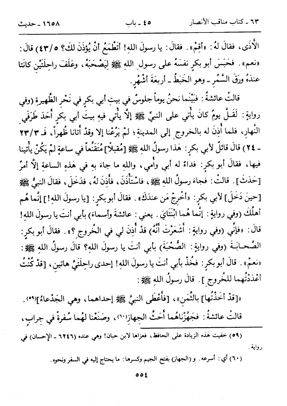 قالتْ عائشةُ: فبَيْنَما نحنُ يوماً جلوسٌ في بيتِ أبي بكرٍ في نَحْرِ الظَّهيرةِ (وفي روايةٍ: لَقَلَّ يومٌ كانَ يأتي على النبيِّ - صلى الله عليه وسلم - إلاَّ يأْتي فيهِ بيتَ أبي بكرٍ أَحَدَ طَرَفَيِ النَّهارِ، فلما أُذِنَ له بالخروجِ إلى المدينةِ؛ لمْ يَرُعْنا إلا وقدْ أُتانا ظُهراً، فَ 2/ 23 - 24) قالَ قائلٌ لأبي بكرٍ: هذا رسولُ اللهِ - صلى الله عليه وسلم -[مُقبلاً]، مُتَقَنِّعاً في ساعةٍ لمْ يَكُنْ يأْتينا فيها، فقالَ أبو بكرٍ: فداءٌ له أبي وأُمي، واللهِ ما جاءَ بهِ في هذهِ الساعةِ إلاَّ أمرٌ [حَدَثَ]. قالتْ: فجاءَ رسولُ اللهِ - صلى الله عليه وسلم -، فاسْتَأذَنَ، فأذِنَ لهُ، فدَخَلَ، فقالَ النبيُّ - صلى الله عليه وسلم -[حينَ دَخَلَ] لأبي بكرٍ: "أخْرِجْ مَن عندَكَ". فقالَ أبو بكرٍ: [يا رسولَ اللهِ!، إنَّما هُم أهلُكَ (وفي روايةٍ: إنَّما هُما ابْنَتَايَ. يعني: عائشةَ وأسماءَ) بأبي أنتَ يا رسولَ اللهِ! قالَ: "فإنِّي (وفي روايةٍ: أَشعَرْتَ أَنَّهُ) قدْ أُذِنَ لي في الخُروجِ؟ ". فقالَ أبو بكرٍ: الصَّحابَةَ (وفي روايةٍ: الصُّحْبَةَ) بأبي أنتَ يا رسولَ اللهِ؟ قالَ رسولُ اللهِ - صلى الله عليه وسلم -: "نعمْ". قالَ أبو بكرٍ: فخُذْ بأبي أنتَ يا رسولَ اللهِ! إحدى راحِلَتَىَّ هاتينِ، [قدْ كُنْتُ أعْدَدْتُهما للخُروجِ]. قالَ رسولُ الله - صلى الله عليه وسلم -: